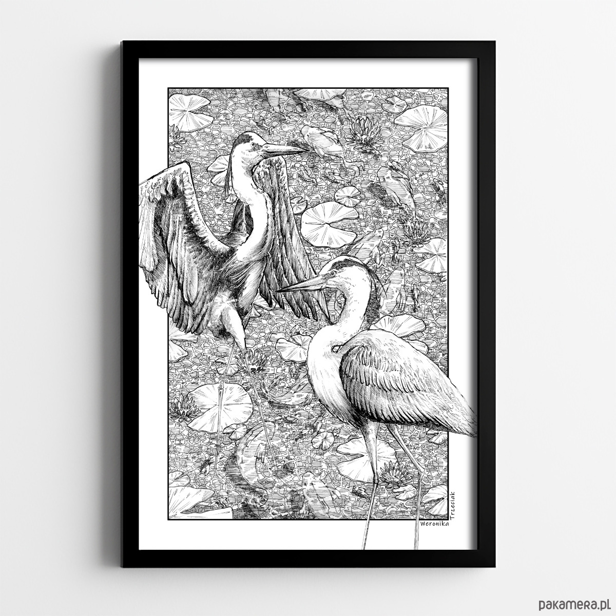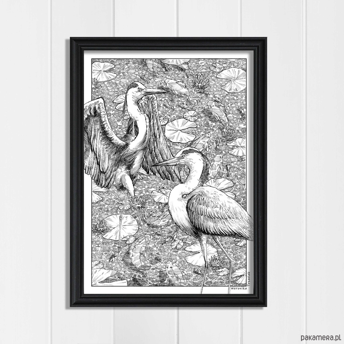 Autorska grafika z czaplami. Oryginał jest ręcznie rysowany za pomocą cienkopisów.