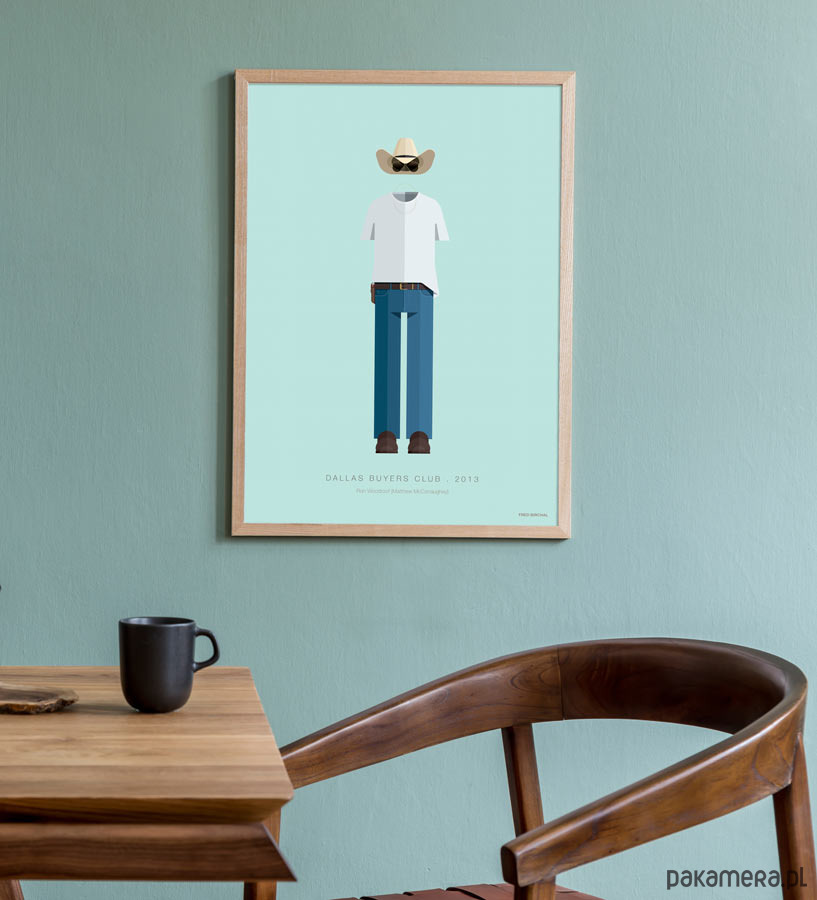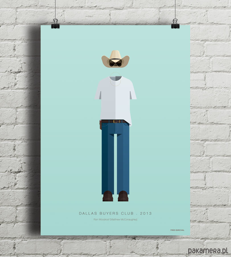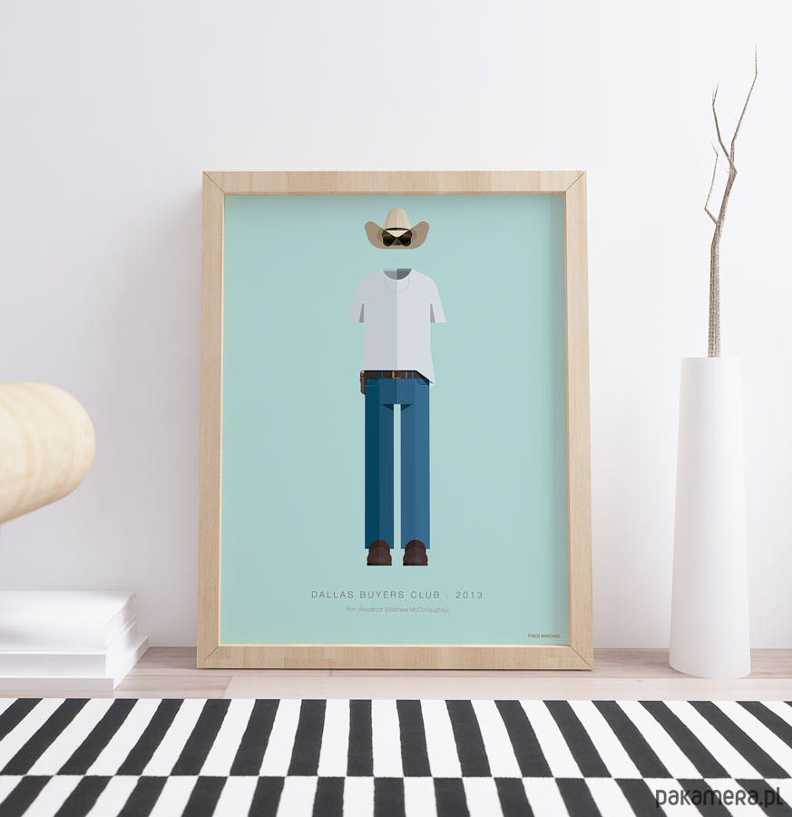 Plakat z autorską grafiką inspirowany filmem "Witaj W Klubie" (Dallas Buyers Club), reż. Jean-Marc Vallée. Pochodzi z serii "Cinema Costumes" (Kostiumy kinowe) i przedstawia strój Rona Woodroofa.
