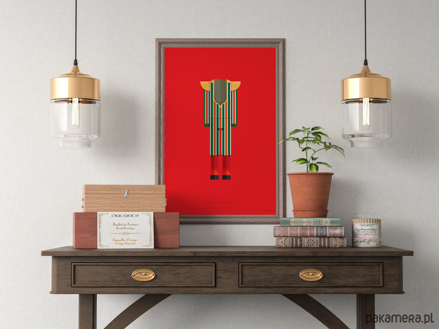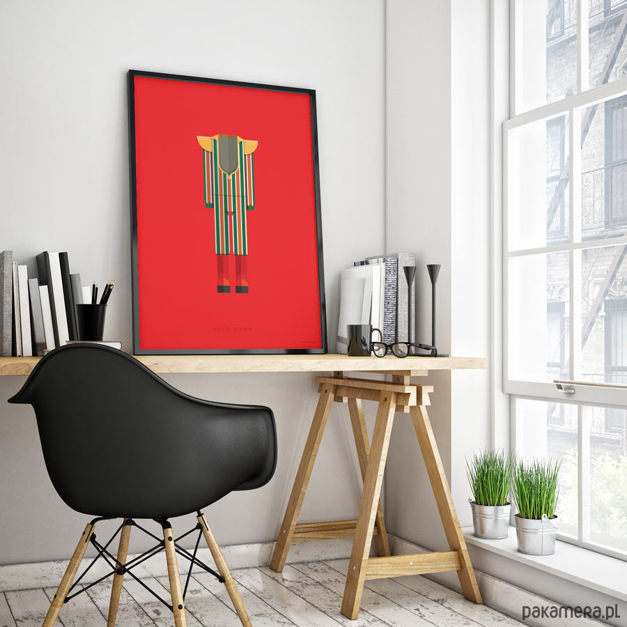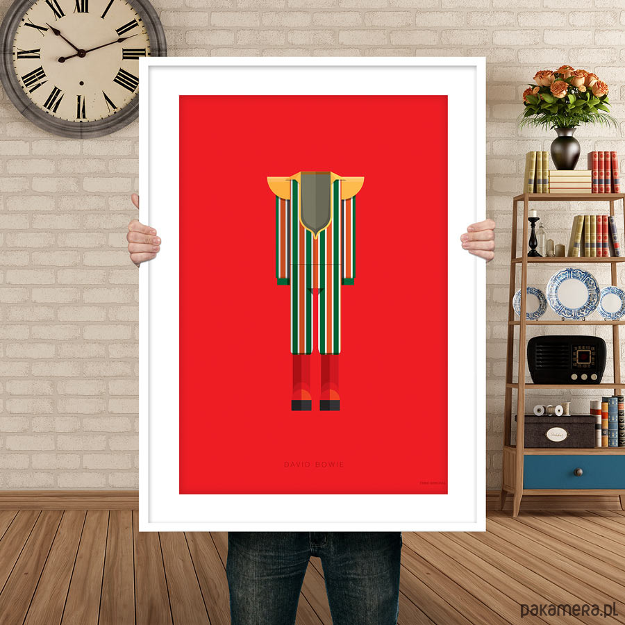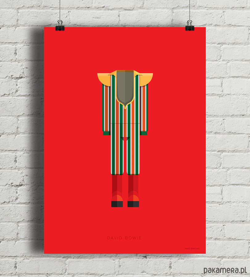 Plakat z autorską grafiką inspirowany Davidem Bowiem. Pochodzi z serii "Kostiumy muzyczne" i przedstawia zaprojektowany przez Kansai Yamamoto kosmiczny strój z okresu Ziggiego Stardusta wraz z czerwonymi butami na gigantycznym koturnie, które stały się symbolem glam-rocka.