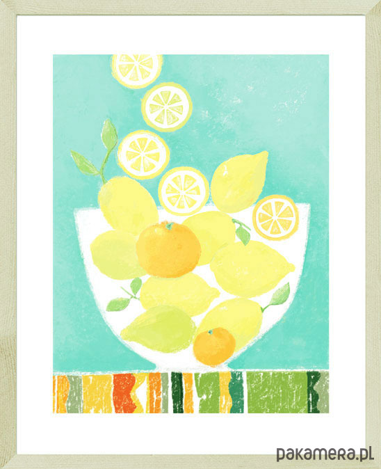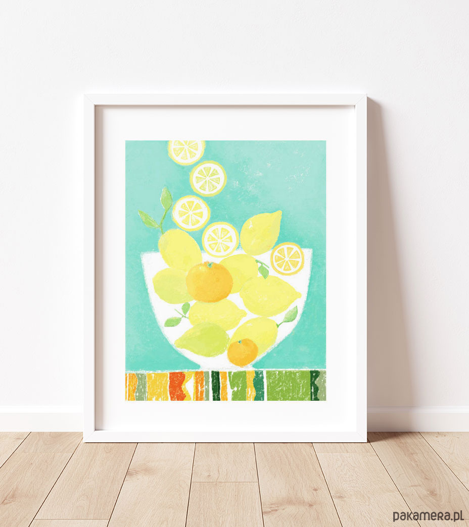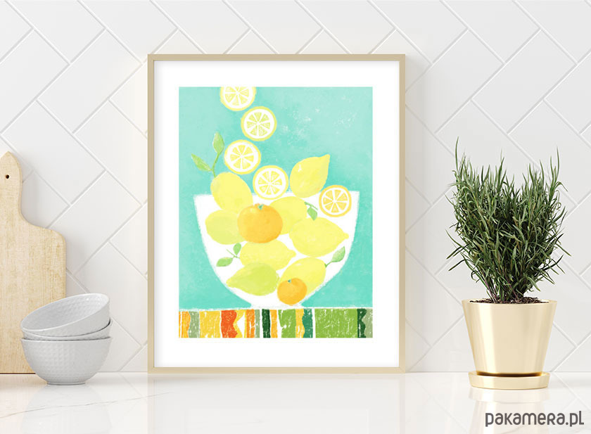Kolory mają swoją moc, szczególnie kiedy za oknem szaro i ponuro. Orzeźwiające, soczyste żółte cytryny na turkusowym tle dodadzą wnętrzu świeżości i dobrej energii. Dekoracja w sam raz do kuchni, jadalni, kawiarni lub restauracji. Autorski projekt, wysoka jakość wydruku. Plakat drukowany jest z białym marginesem (passe partout).