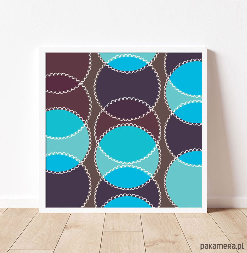 Abstrakcyjny plakat z turkusowymi kołami na brązowym tle. Energetyczny, przyciągający wzrok, wyrazisty. Autorski projekt, wysoka jakość wydruku. Plakat drukowany jest bez białego marginesu (passe partout).