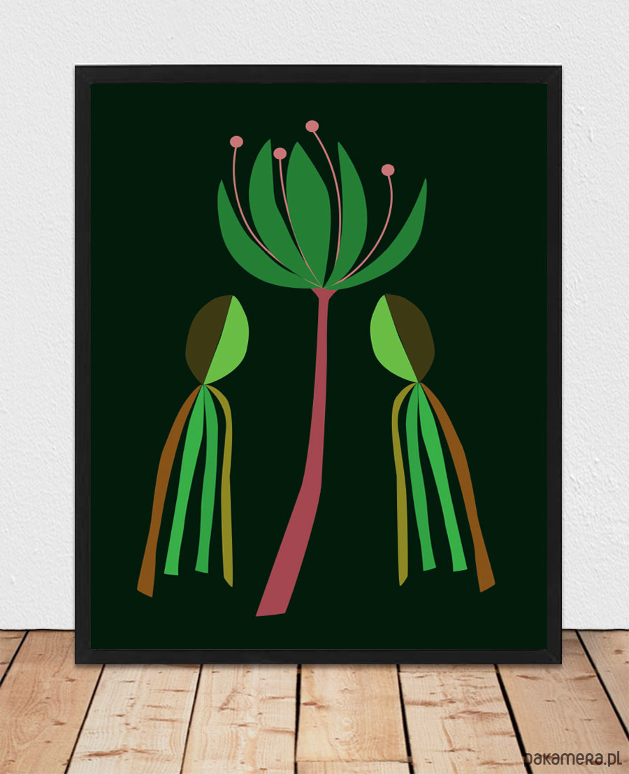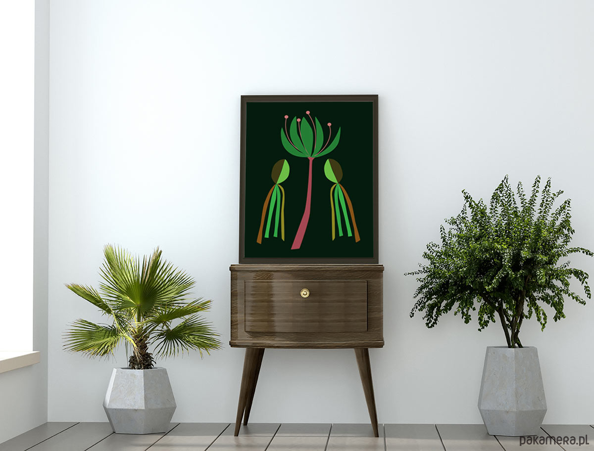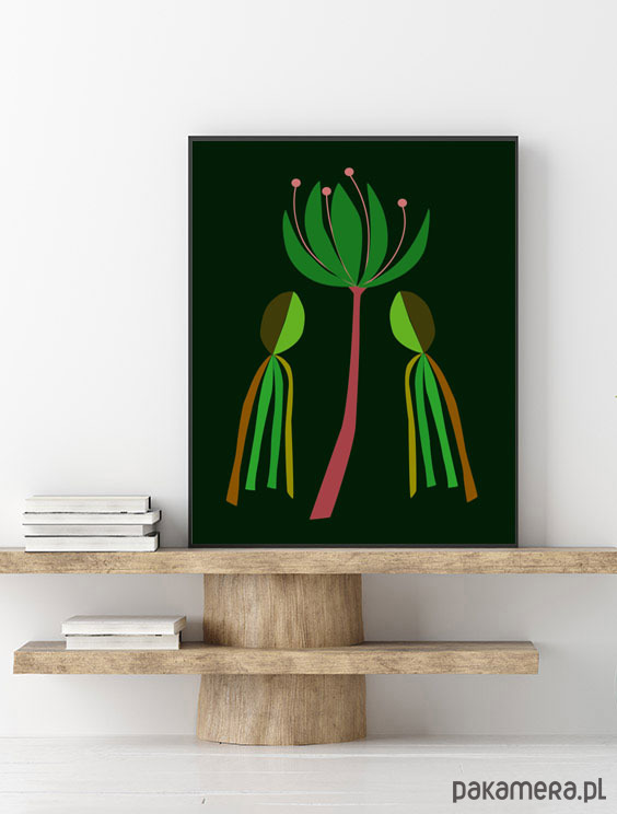 Głęboka czerń, kolorowe motywy kwiatowe, folkowa stylistyka dodadzą wnętrzu oryginalnego charakteru. Autorski projekt, wysoka jakość wydruku. Plakat drukowany jest bez białego marginesu (passe partout).