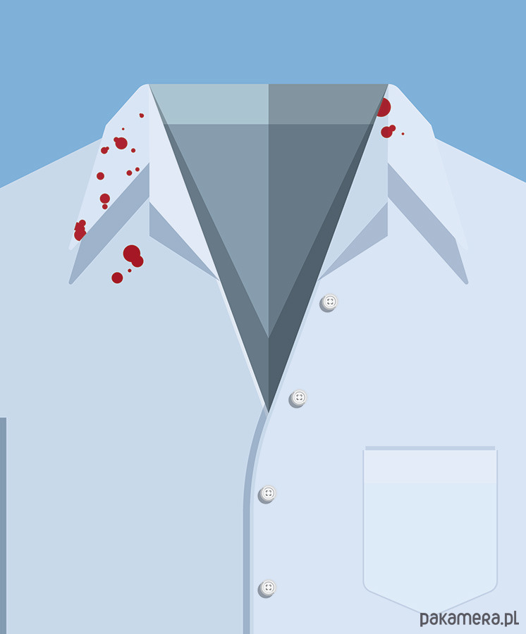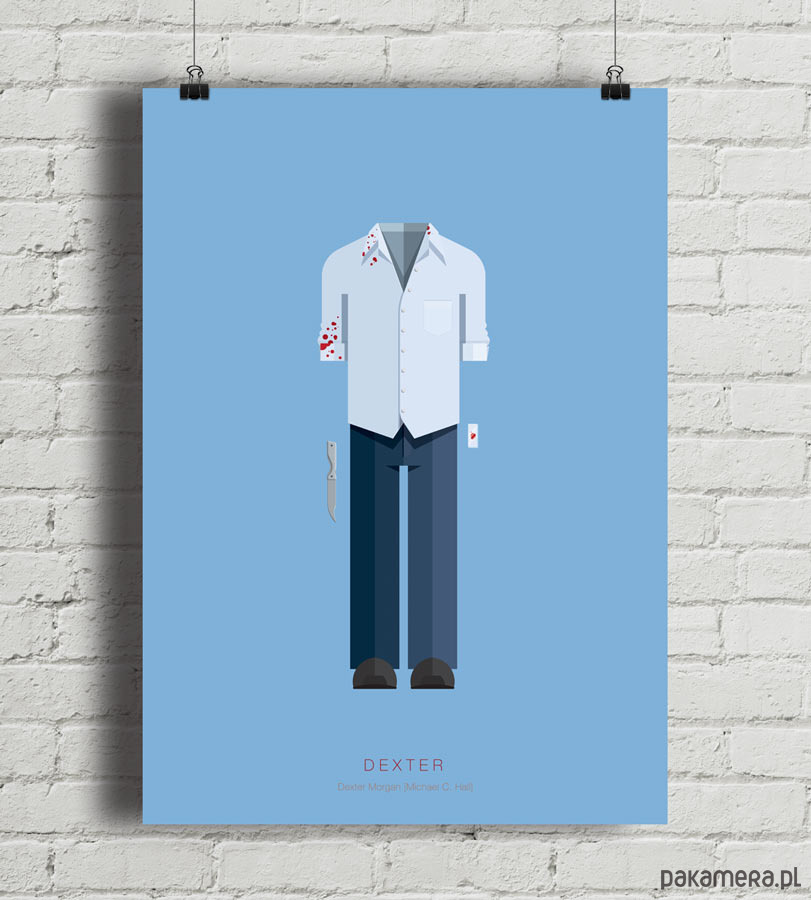 Plakat z autorską grafiką inspirowaną serialem Dexter, stworzonym przez Jamesa Manosa Jr. Pochodzi z serii "Kostiumy z telewizji i kina" i przedstawia strój tytułowego bohatera Dextera Morgana.