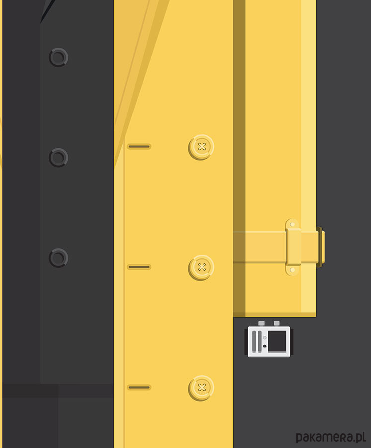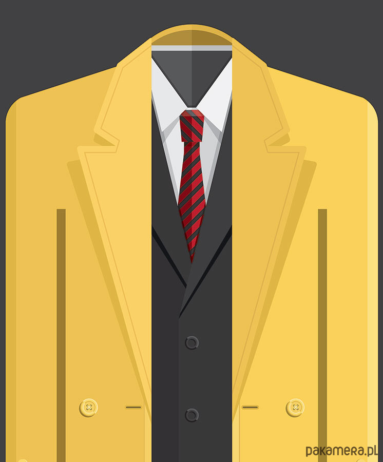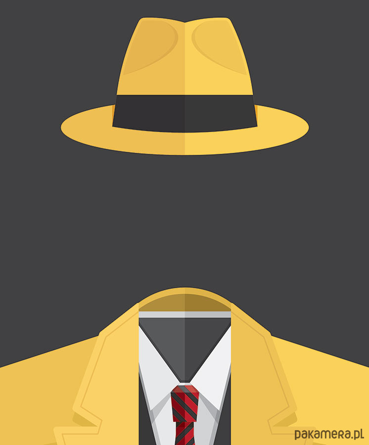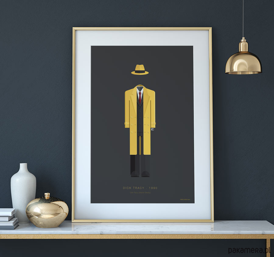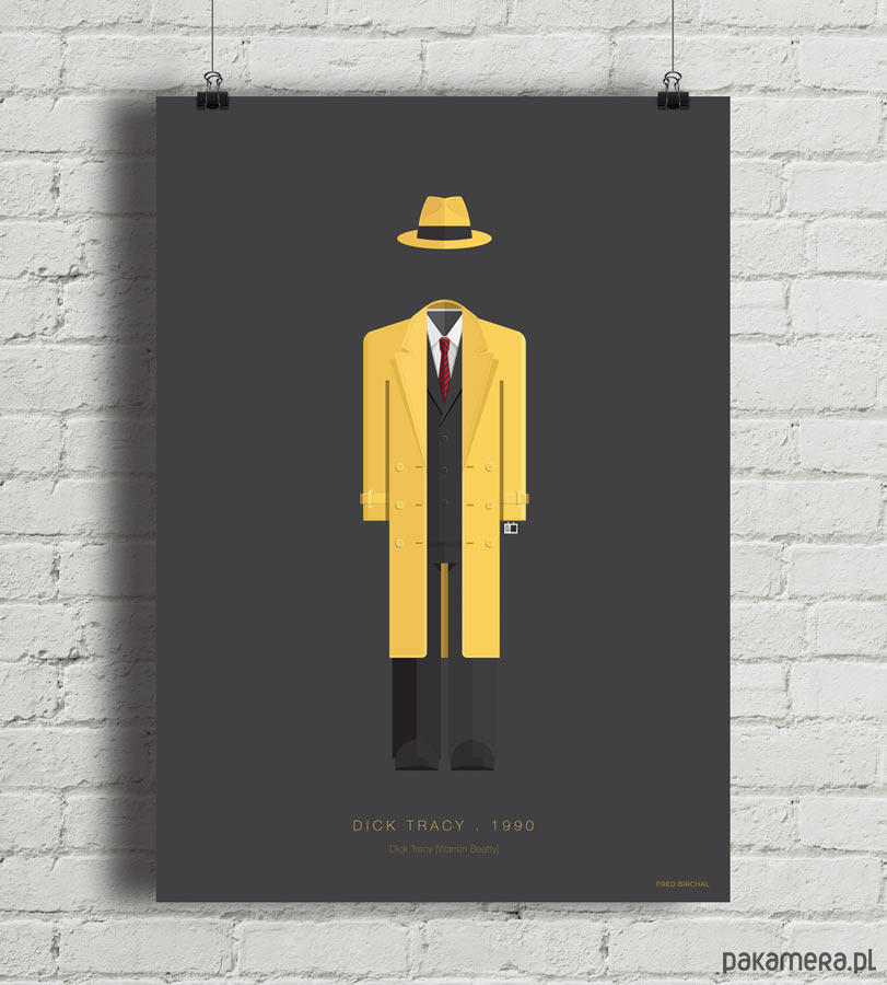 Plakat z autorską grafiką inspirowany filmem Dick Tracy, reż. Warren Beaty. Pochodzi z serii "Cinema Costumes" (Kostiumy kinowe) i przedstawia strój tytułowego bohatera.