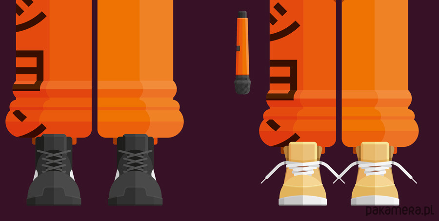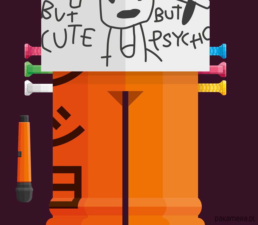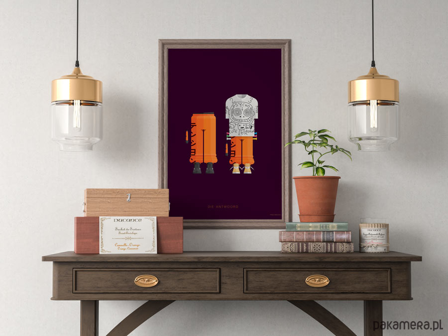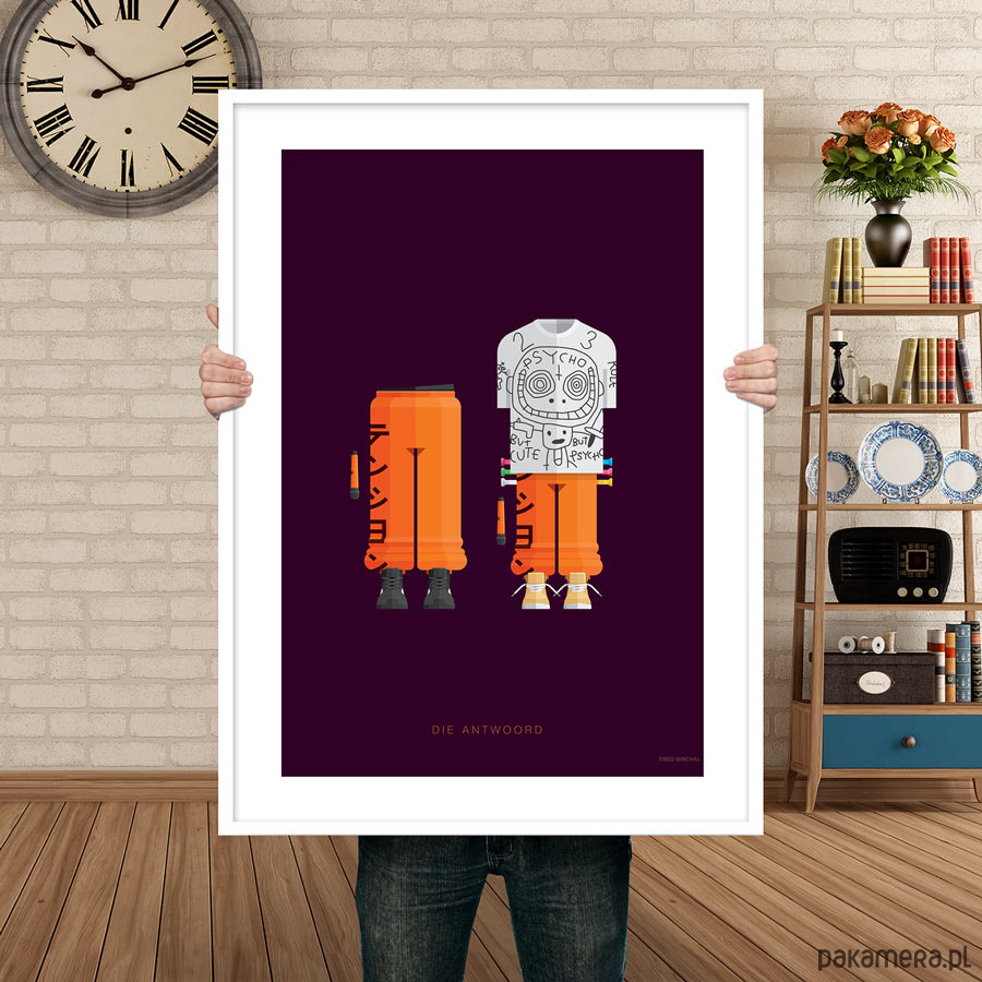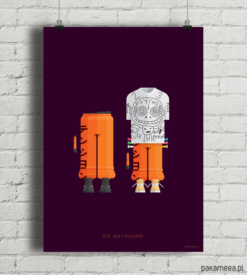 Plakat z autorską grafiką inspirowany południowoafrykańską grupą Die Antwoord. Pochodzi z serii "Kostiumy muzyczne" i przedstawia oryginalne stroje członków zespołu - wywodzące się z kultury hip-hopowej szerokie spodnie, kiczowate kolorowe dodatki oraz koszulki z wulgarnymi rysunkami.