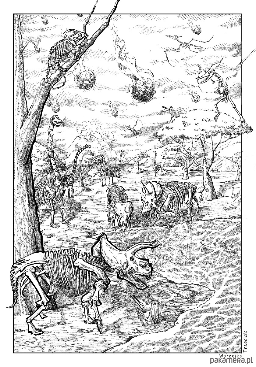 Autorska grafika z szkieletami dinozaurów. Oryginał ręcznie rysowany za pomocą cienkopisów.
