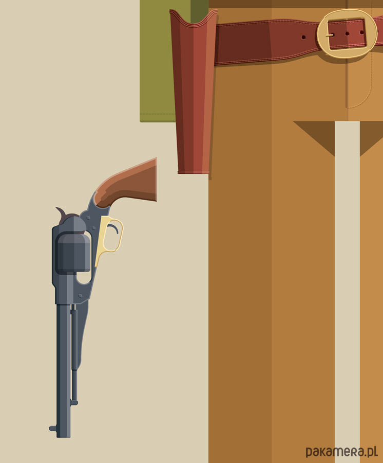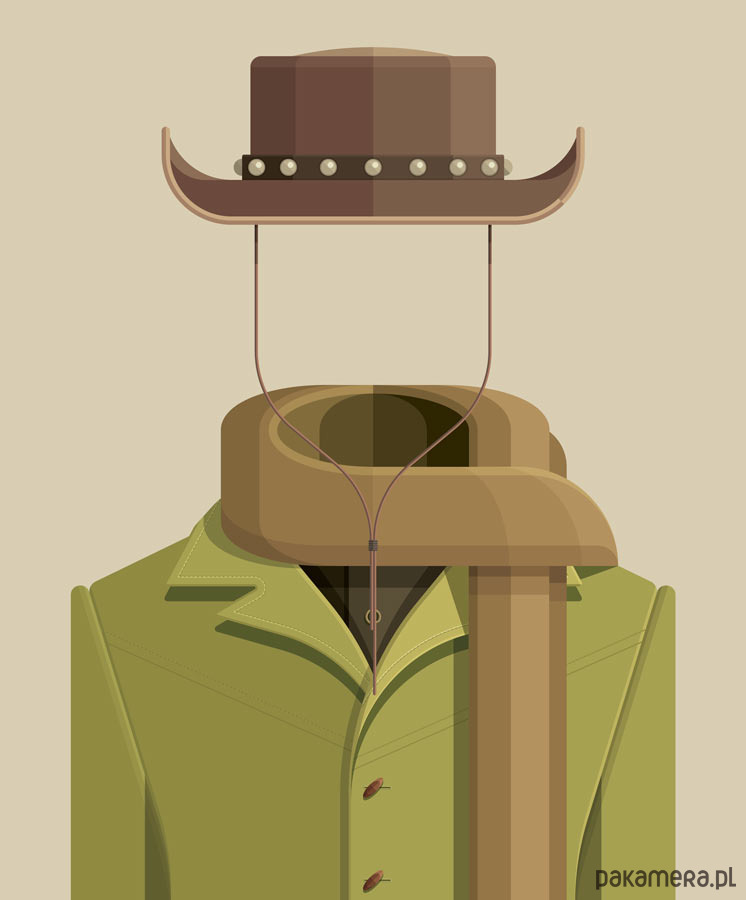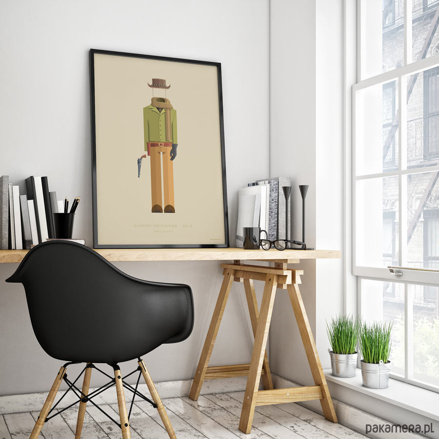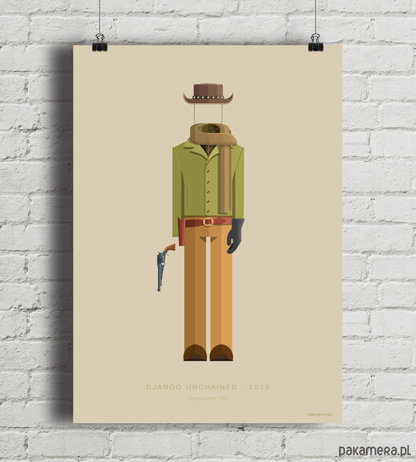 Plakat z autorską grafiką inspirowany filmem Django Unchained, reż. Quentin Tarantino. Pochodzi z serii "Cinema Costumes" (Kostiumy kinowe) i przedstawia strój Django.