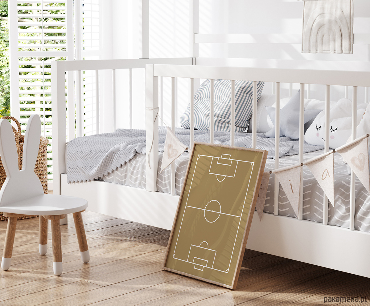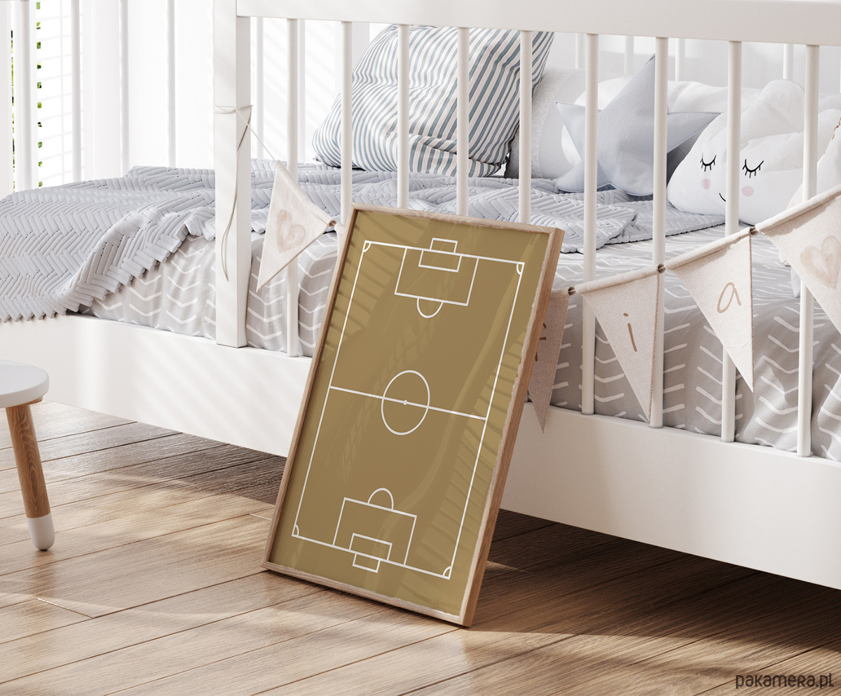 Plakat dla dzieci Gold Soccer Field to nowoczesna dekoracja ścienna inspirowana futbolem. Minimalistyczny wzór linii boiska do piłki nożnej tworzy wyjątkowy efekt wizualny. To idealny wybór dla miłośników sportu, a zwłaszcza młodych fanów piłki nożnej, którzy chcą wnieść do swojego pokoju energię i charakter.
