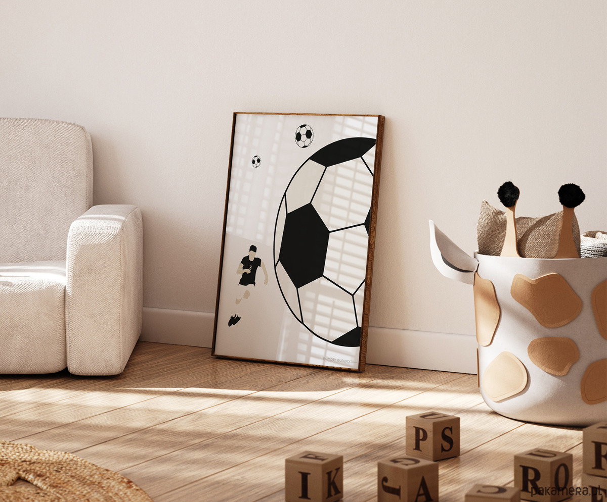 Plakat dla dzieci White Soccer Fun to nowoczesna dekoracja ścienna inspirowana pasją do futbolu. Minimalistyczny wzór z dużą piłką i sylwetkami piłkarzy na tle białym tworzy wyjątkowy efekt wizualny, który od razu przyciąga wzrok. To idealny wybór dla miłośników sportu, a zwłaszcza młodych fanów piłki nożnej, którzy chcą wnieść do swojego pokoju energię i charakter.