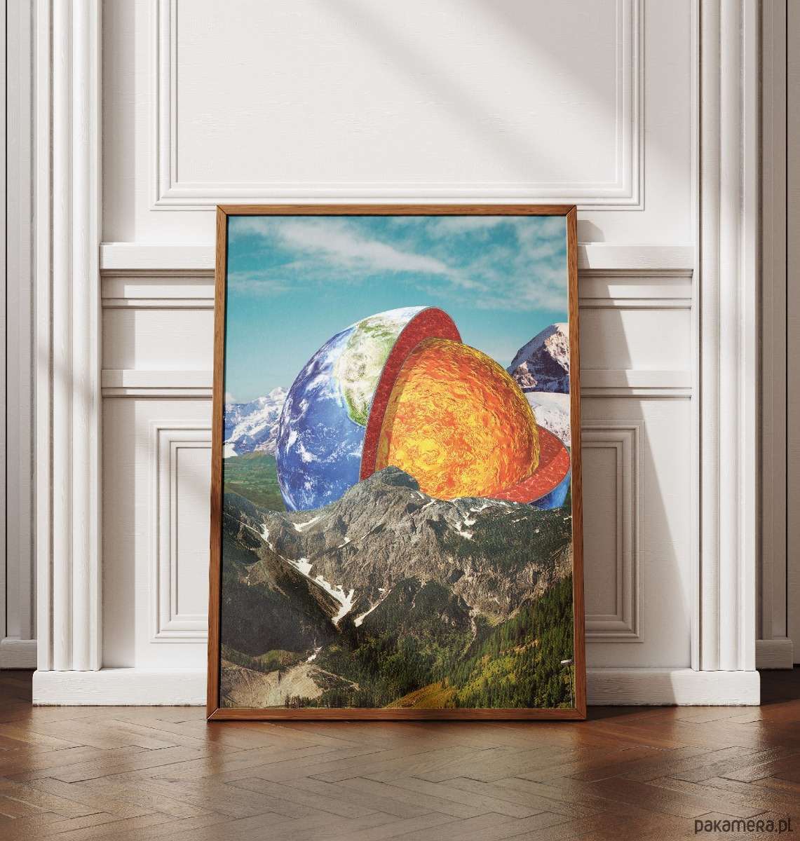 Odważne połączenie edukacyjnej ryciny z potężnym krajobrazem górskim, utrzymane w estetyce dawnych wydań National Geographic. Centralnym punktem grafiki jest gigantyczny przekrój globu, odsłaniający płonące jądro ziemi, który wyłania się zza ośnieżonych szczytów niczym surrealistyczne słońce. Projekt operuje silnym kontrastem między chłodnym błękitem nieba a żarem bijącym z wnętrza planety, tworząc obraz, który jest jednocześnie monumentalny i naukowo fascynujący.