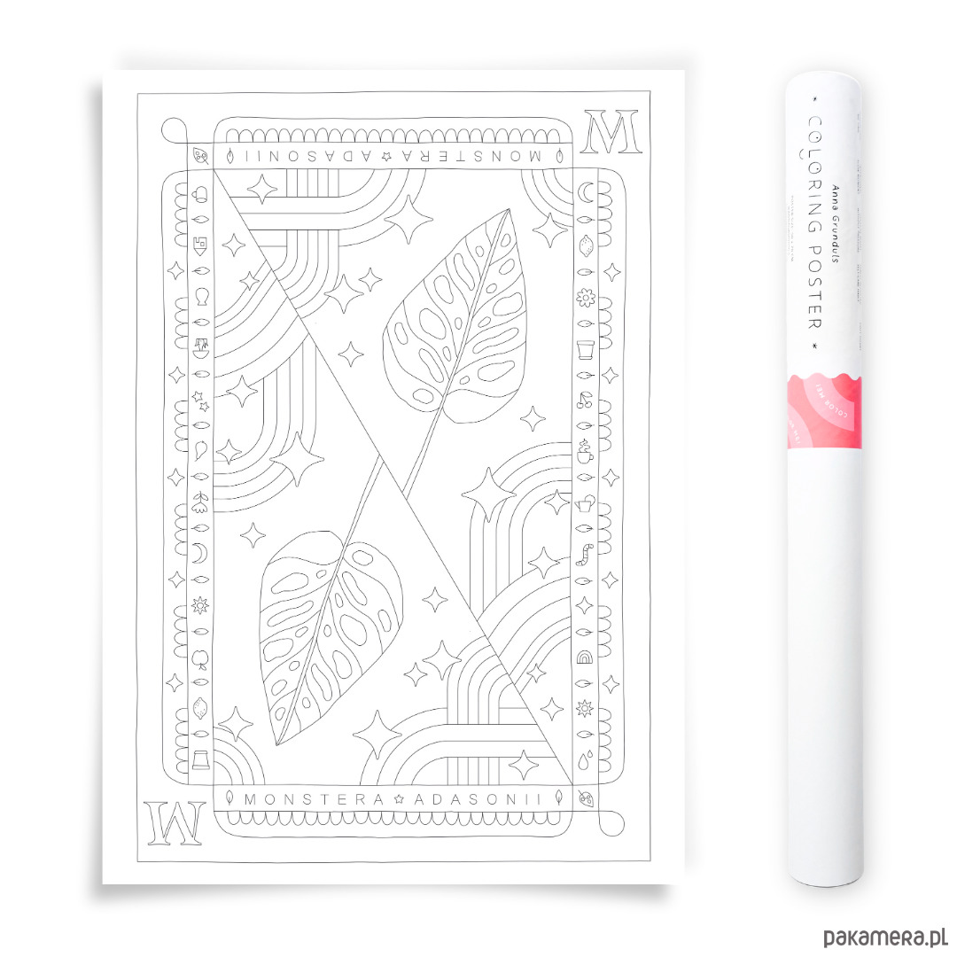 Jej charakterystyczne liście z „okienkami” świetnie odnajdują się wśród gwiazdek i tęczowych fal. Wystarczy wyciągnąć kredki, markery albo ulubione mazaki i odpłynąć w zielone zen. Ten plakat to nie tylko dekoracja – to rytuał relaksu i radości.