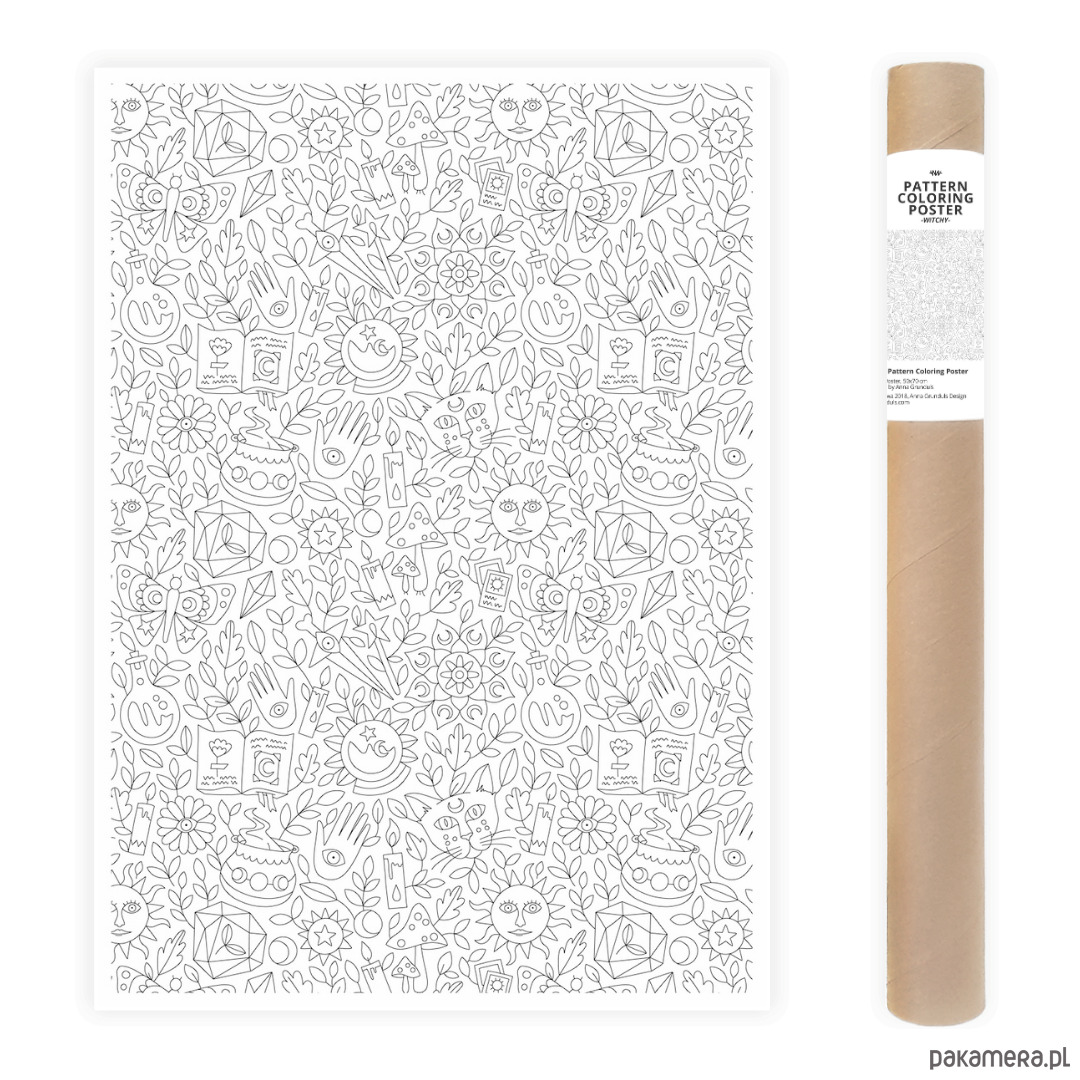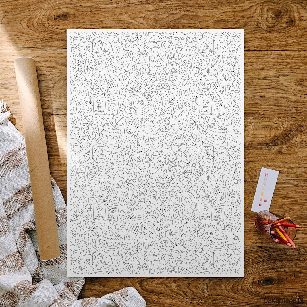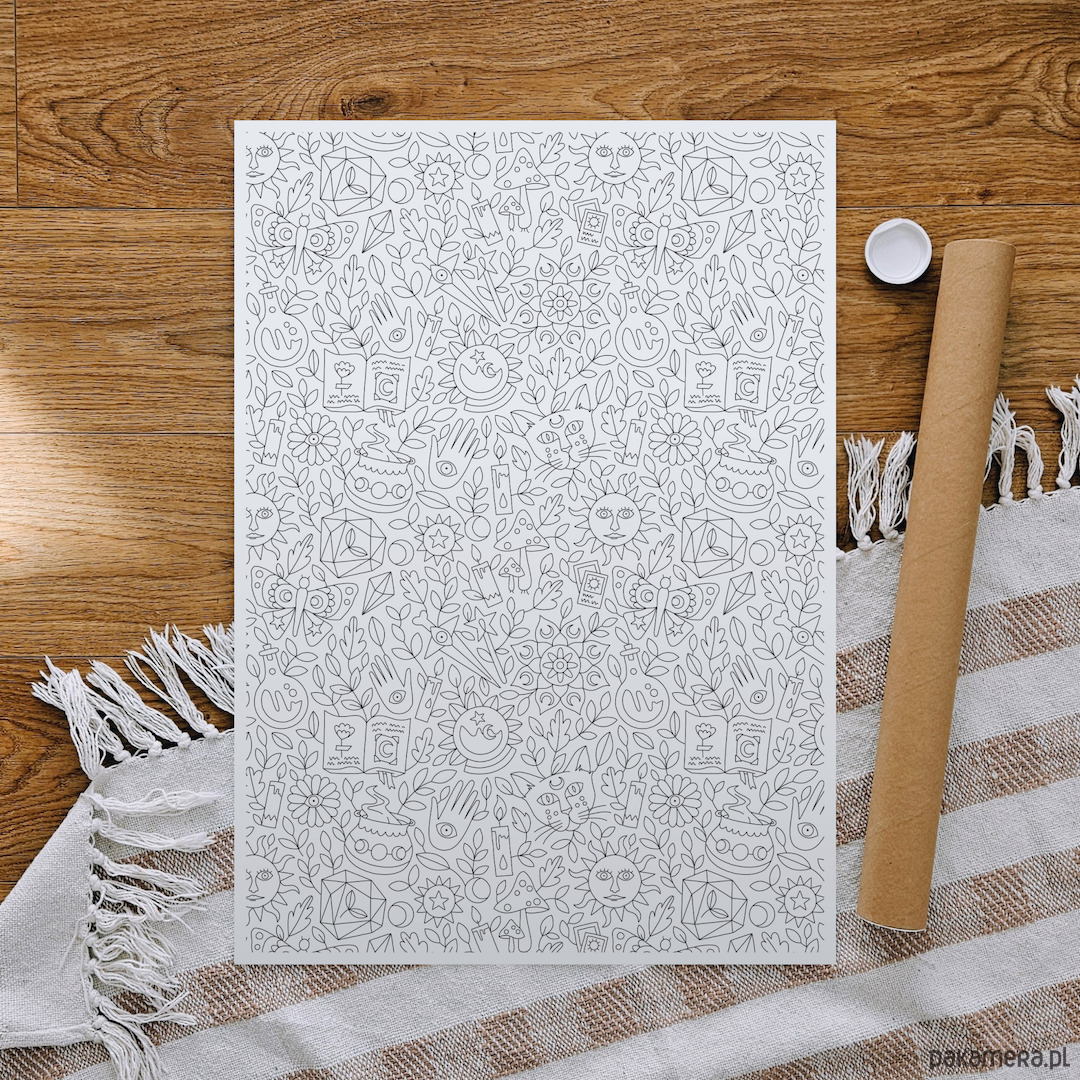 Tu się dzieje magia! Są koty, magiczne symbole, słońca, księżyce, ale najważniejsze jest, żeby dobrze się bawić przy kolorowaniu. Ten plakat to czysta radość z drobiazgów – idealny, kiedy masz tylko kwadrans dla siebie i chcesz go spędzić kreatywnie, a nie wpatrując się w ekran.
