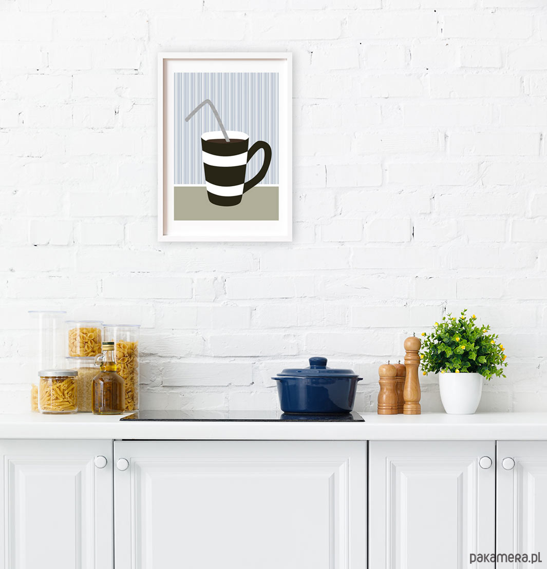 Minimalistyczny plakat z pasiastym kubkiem gorącej czekolady to dekoracja w sam raz do kuchni, jadalni, kawiarni lub restauracji. Doda wnętrzu świeżości i oryginalnego charakteru. Można na nim zwiesić oko podjadając ulubione smakołyki ;)
