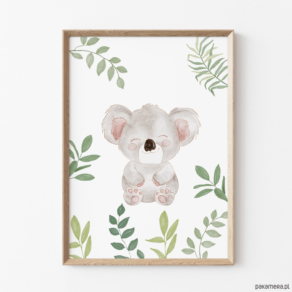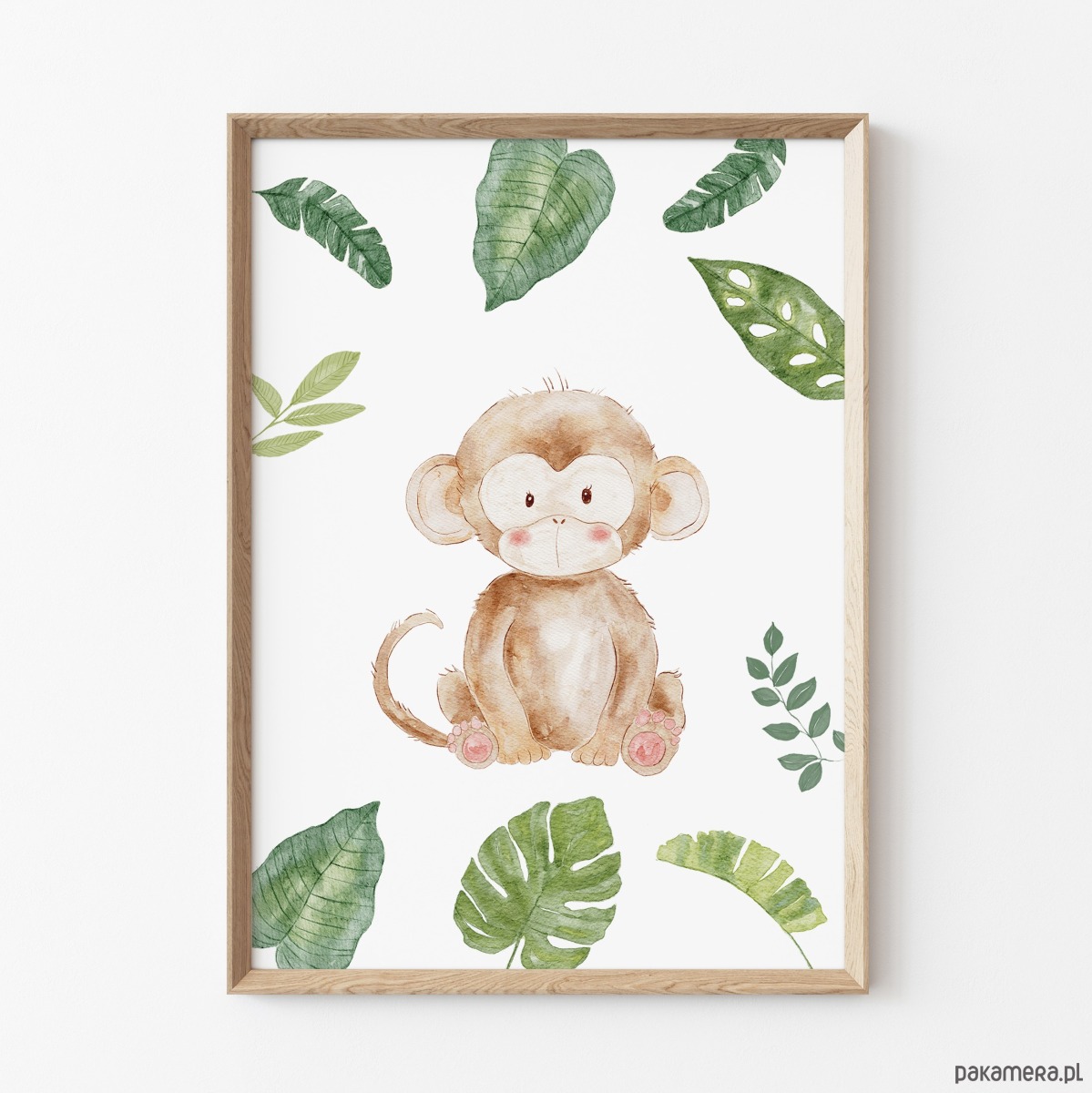W centrum obrazka znajduje się urocze zwierzątko otoczone tropikalnymi liśćmi, w przyjaznej kolorystyce.