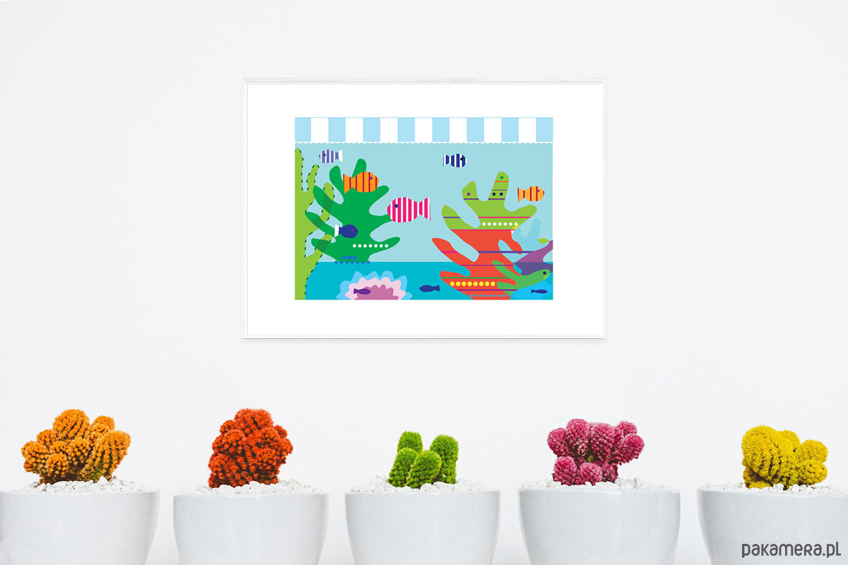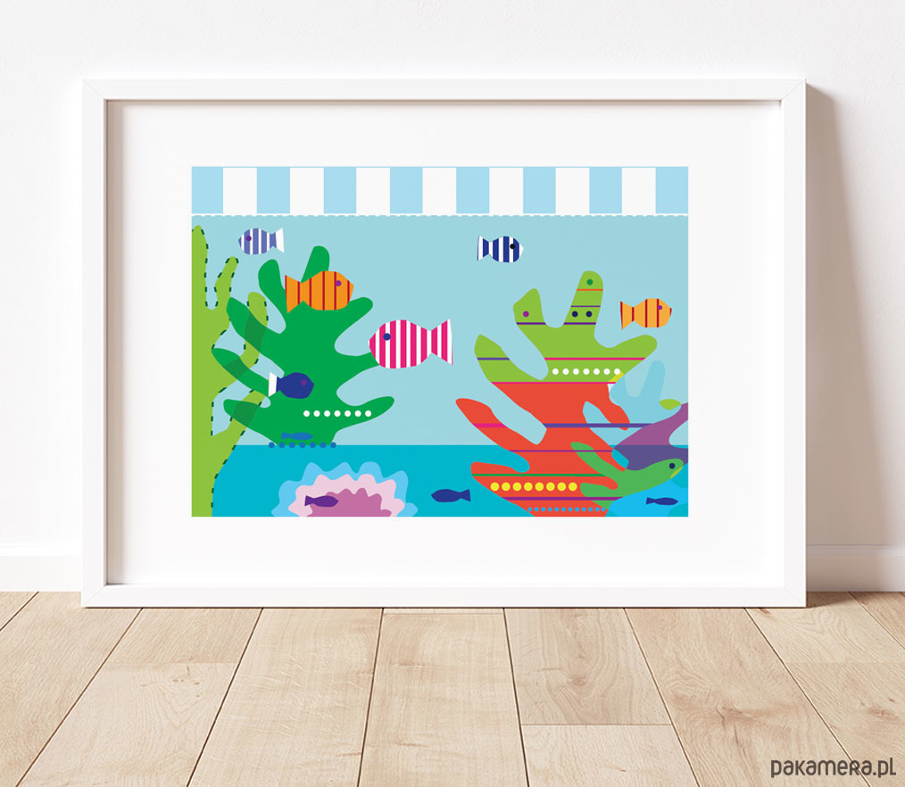 Plakat przedstawiający podwodny świat to bardzo kolorowa dekoracja idealna do dziecięcego pokoju lub nadmorskich apartamentów. Wprowadzi radosny nastrój i nada wnętrzu oryginalnego charakteru.
