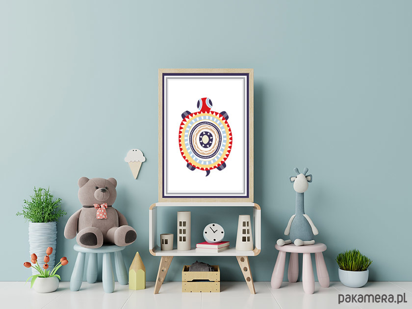 Kolorowy żółwik we wzorki to miły akcent dekoracyjny w pokoju maluszka. Autorska ilustracja, wysoka jakość wydruku. Plakat drukowany jest bez białego marginesu (passe partout).