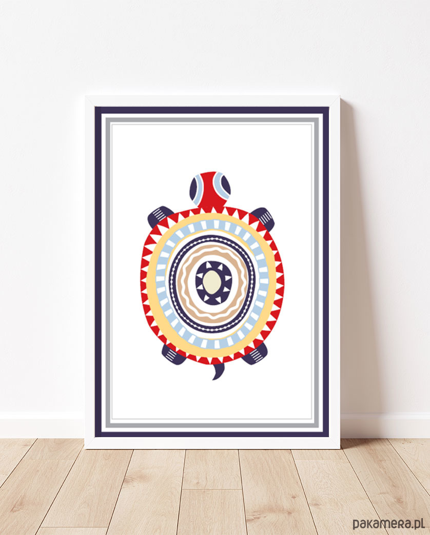 Kolorowy żółwik we wzorki to miły akcent dekoracyjny w pokoju maluszka. Autorska ilustracja, wysoka jakość wydruku. Plakat drukowany jest bez białego marginesu (passe partout).