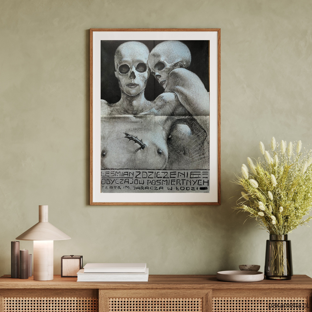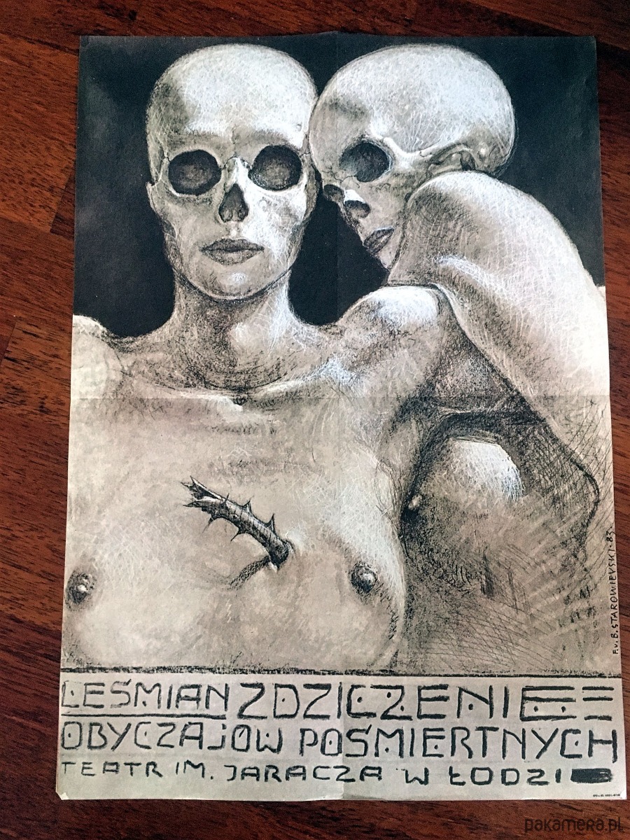 Plakat Zdziczenie obyczajów Pośmiertnych, autorstwa Franciszka Starowieyskiego, do spektaklu wg powieści Bolesława Leśmiana, wystawianego na deskach Teatru im. Jaracza w Łodzi, 1983 r. Plakat dwukrotnie złożony fabrycznie. Plakat sygnowany i datowany w druku. Wymiary: 41x58 cm.