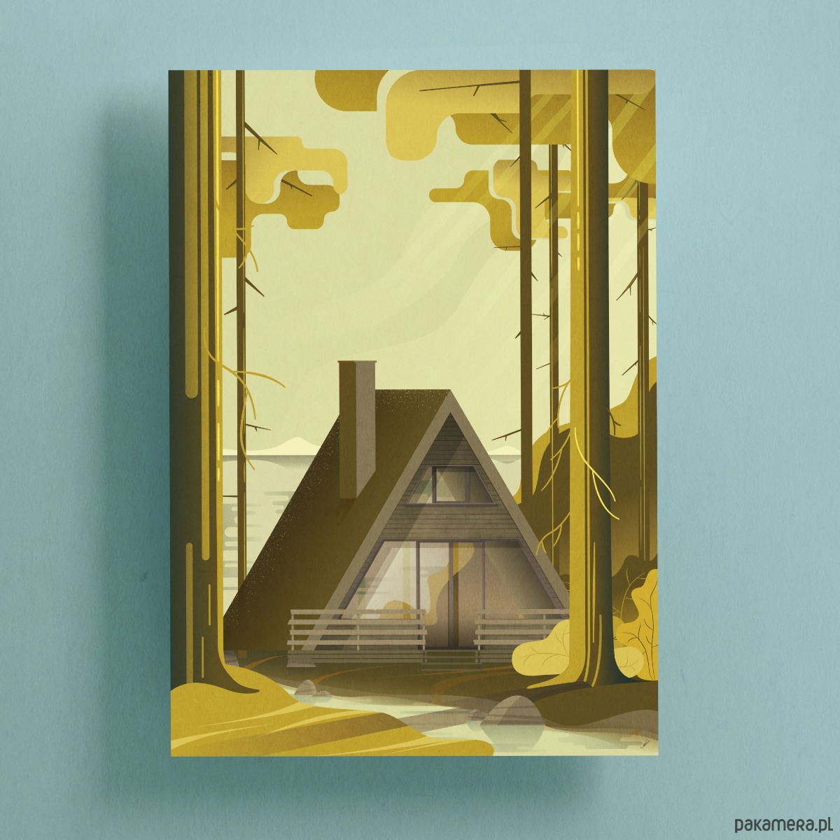 Plakat Domek typu BRDA, letni wywczas nad jeziorem w lesie