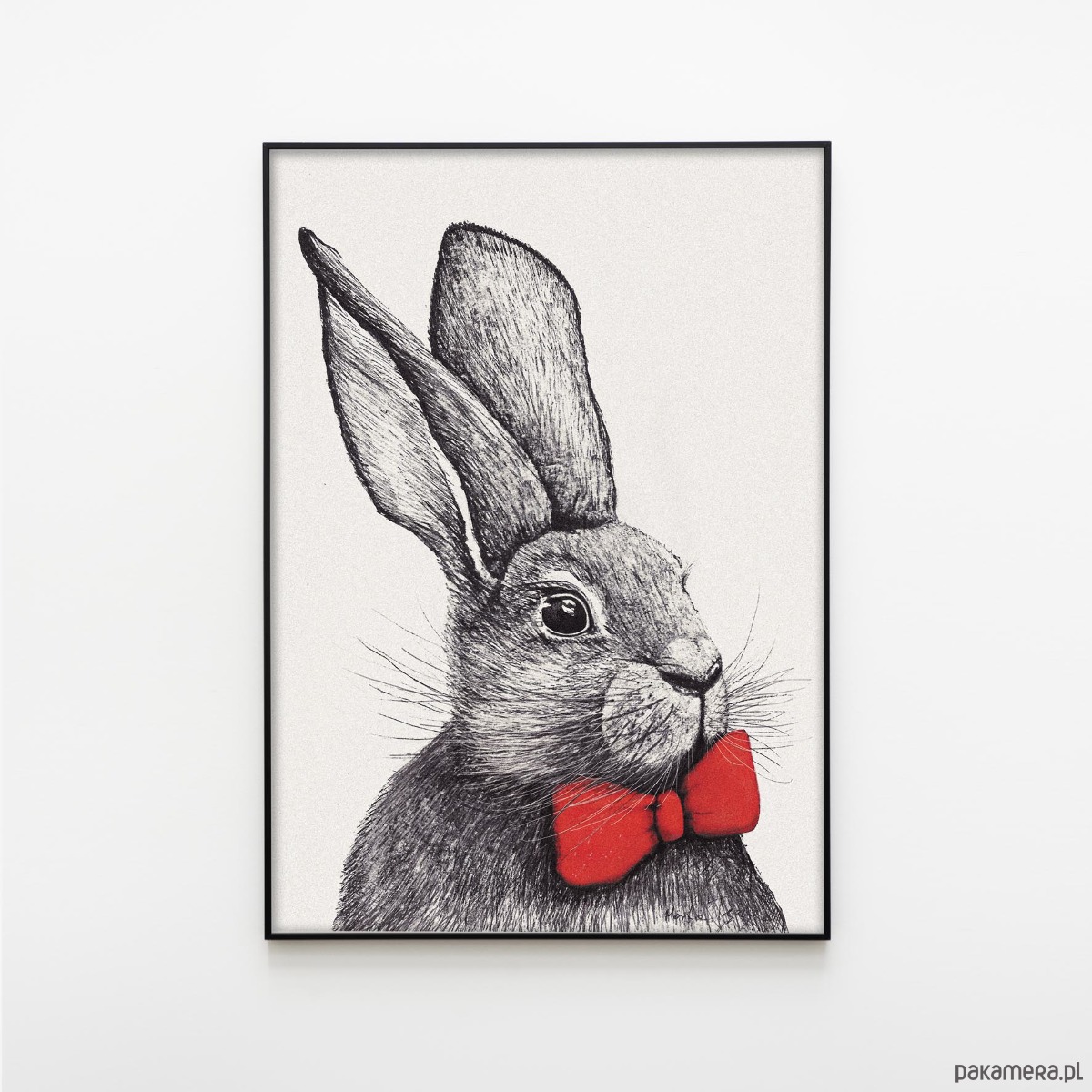 Portret królika w czerwonej muszce, w czerni i bieli na jasnym szarym tle.