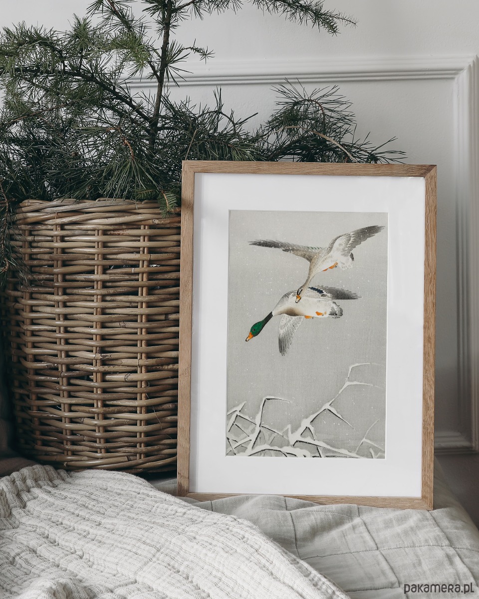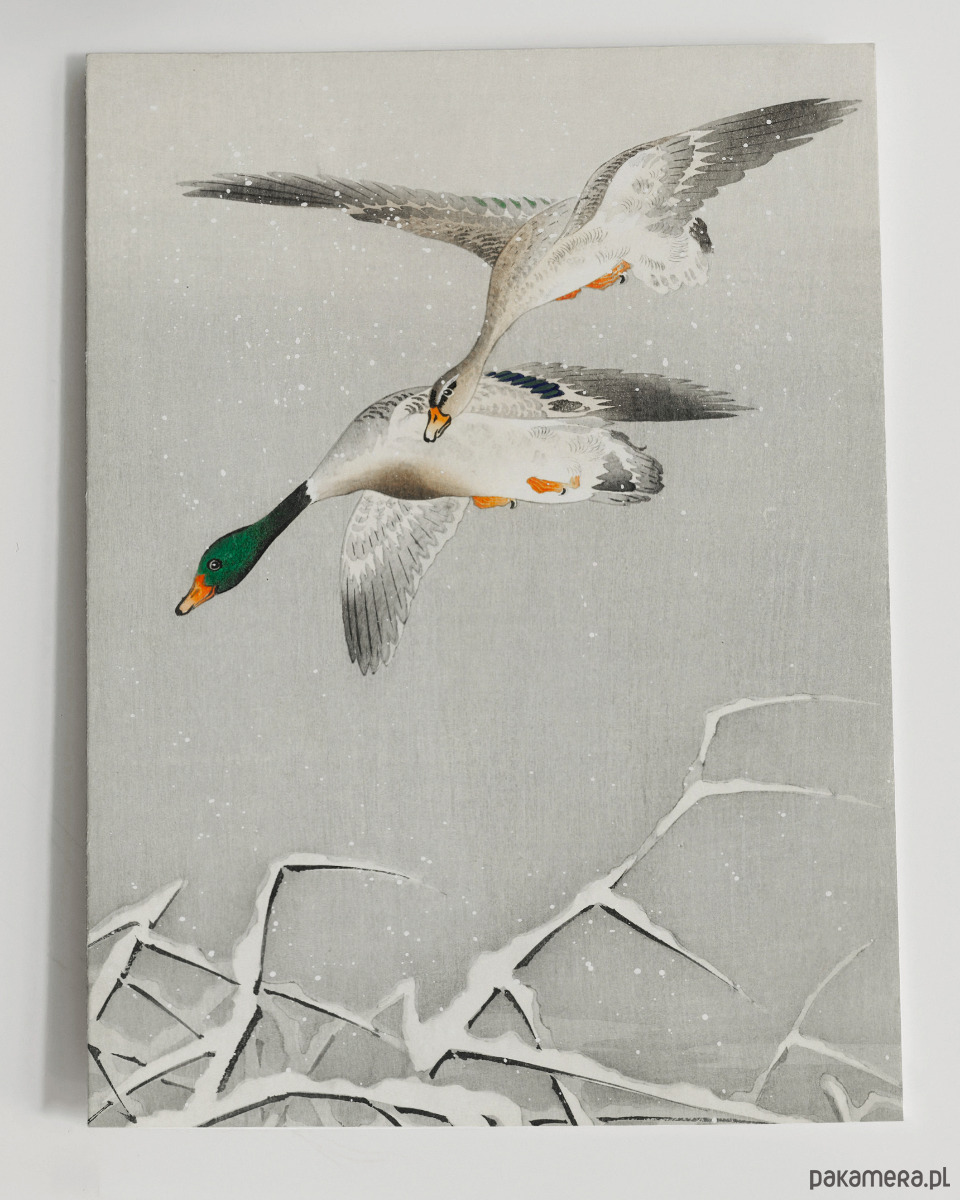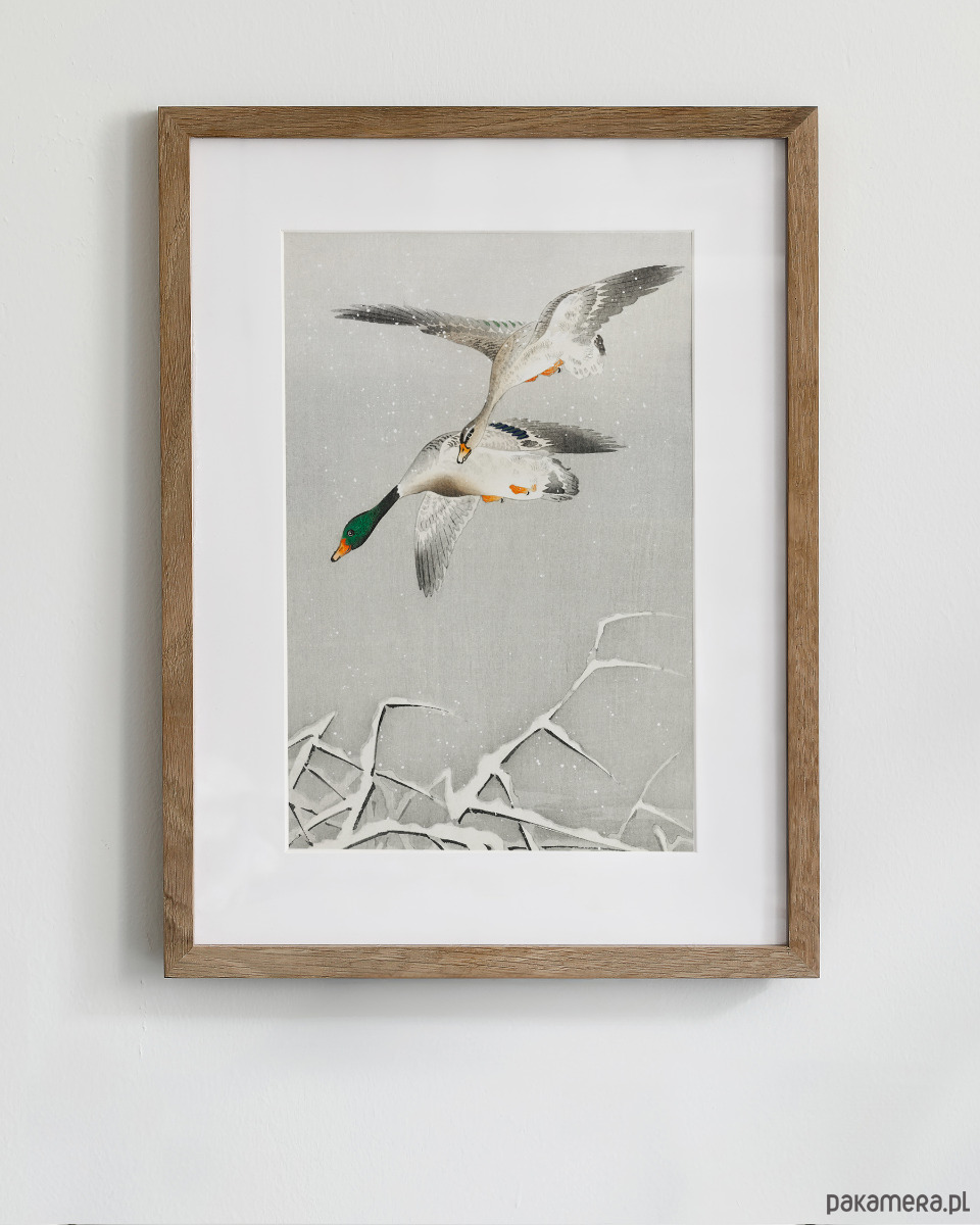 Plakat przedstawiający dwie dzikie kaczki w locie w zimowej scenerii. W tle padający śnieg. Ilustracja wykonana metodą drzeworytu.