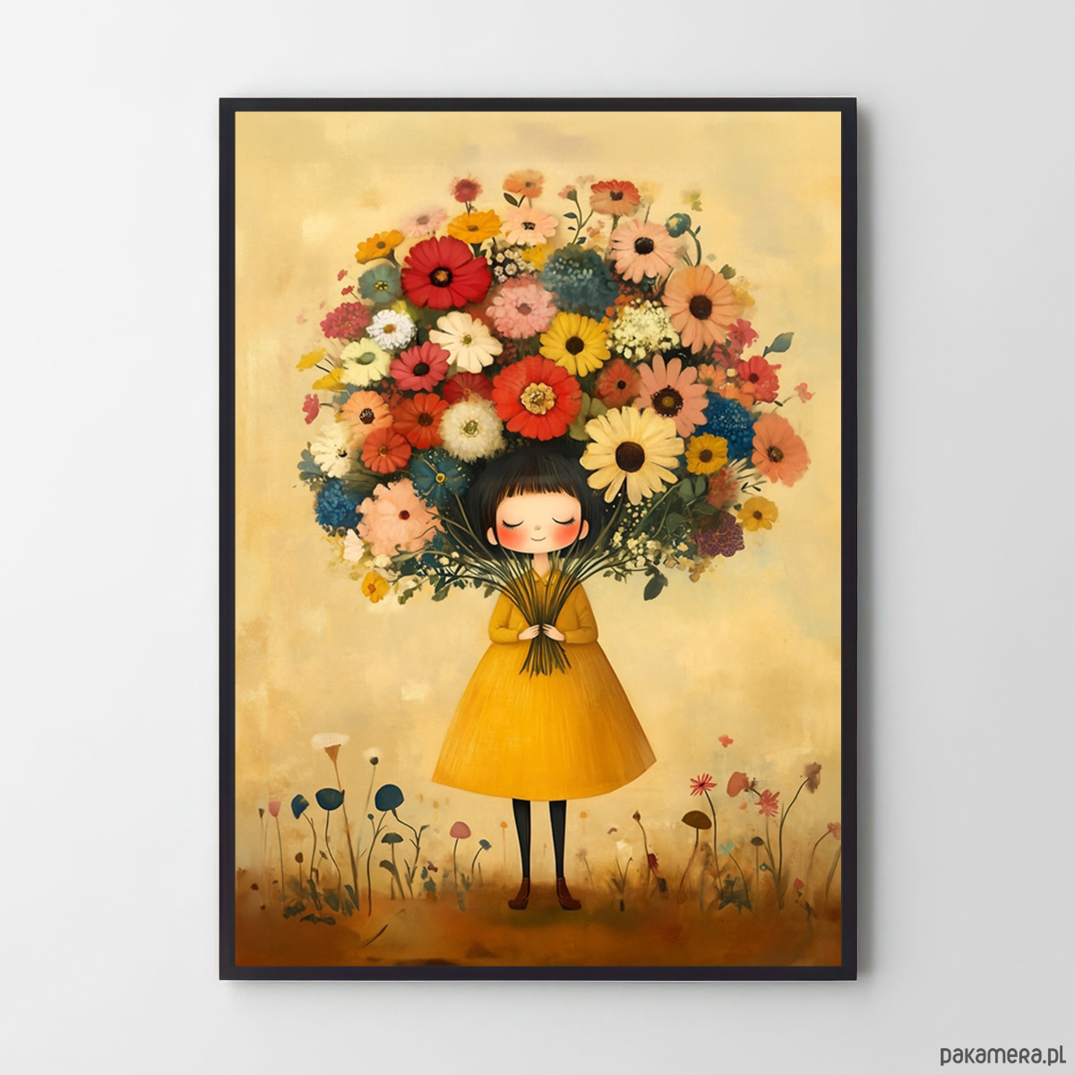 Plakat Dziewczynka w żółtej sukience z bukietem radości