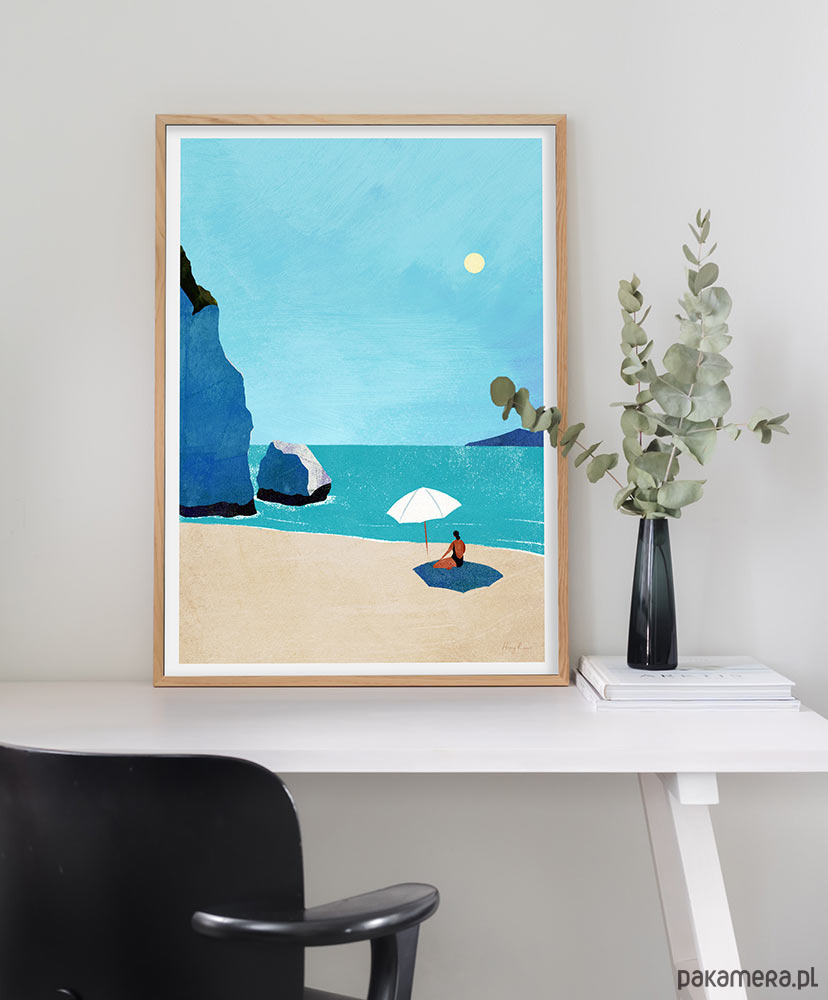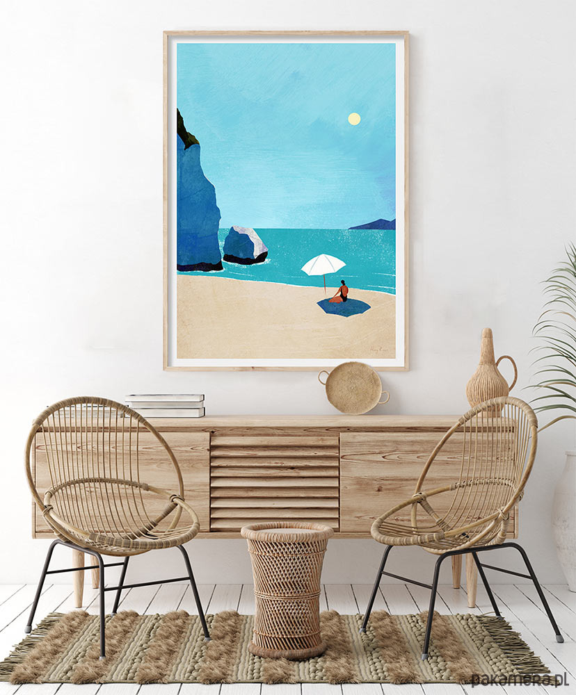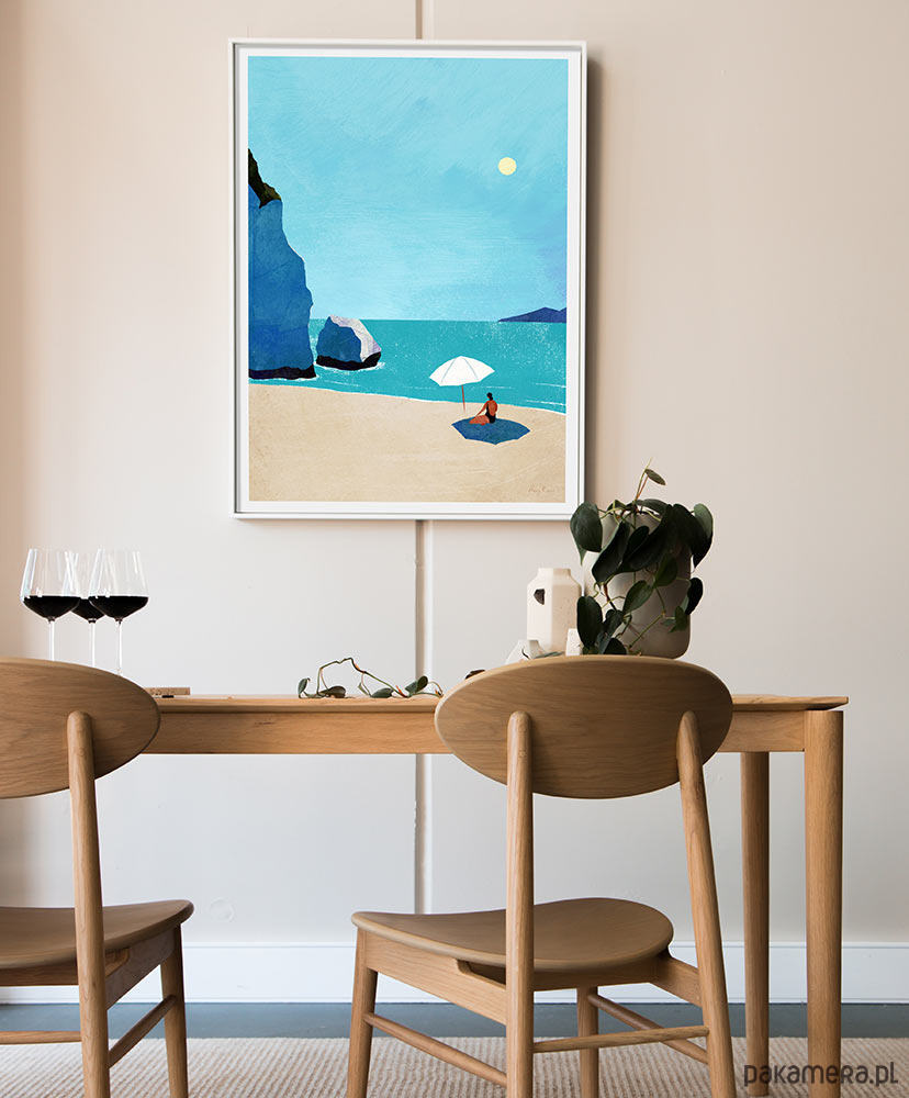 Plakat z dziką plażą będzie idealną dekoracją domu dla każdego, kto pragnie zachować przy sobie marzenie o wakacjach idealnych. Majestatyczne klify wystające z lazurowej wody, złoty piasek i zaciszna plaża wśród skał. Każdy element grafiki zdaje się odznaczać inną fakturą, co tworzy wyjątkowo malowniczy widok. Efektu dopełniają głębokie kolory - błękity i turkusy.