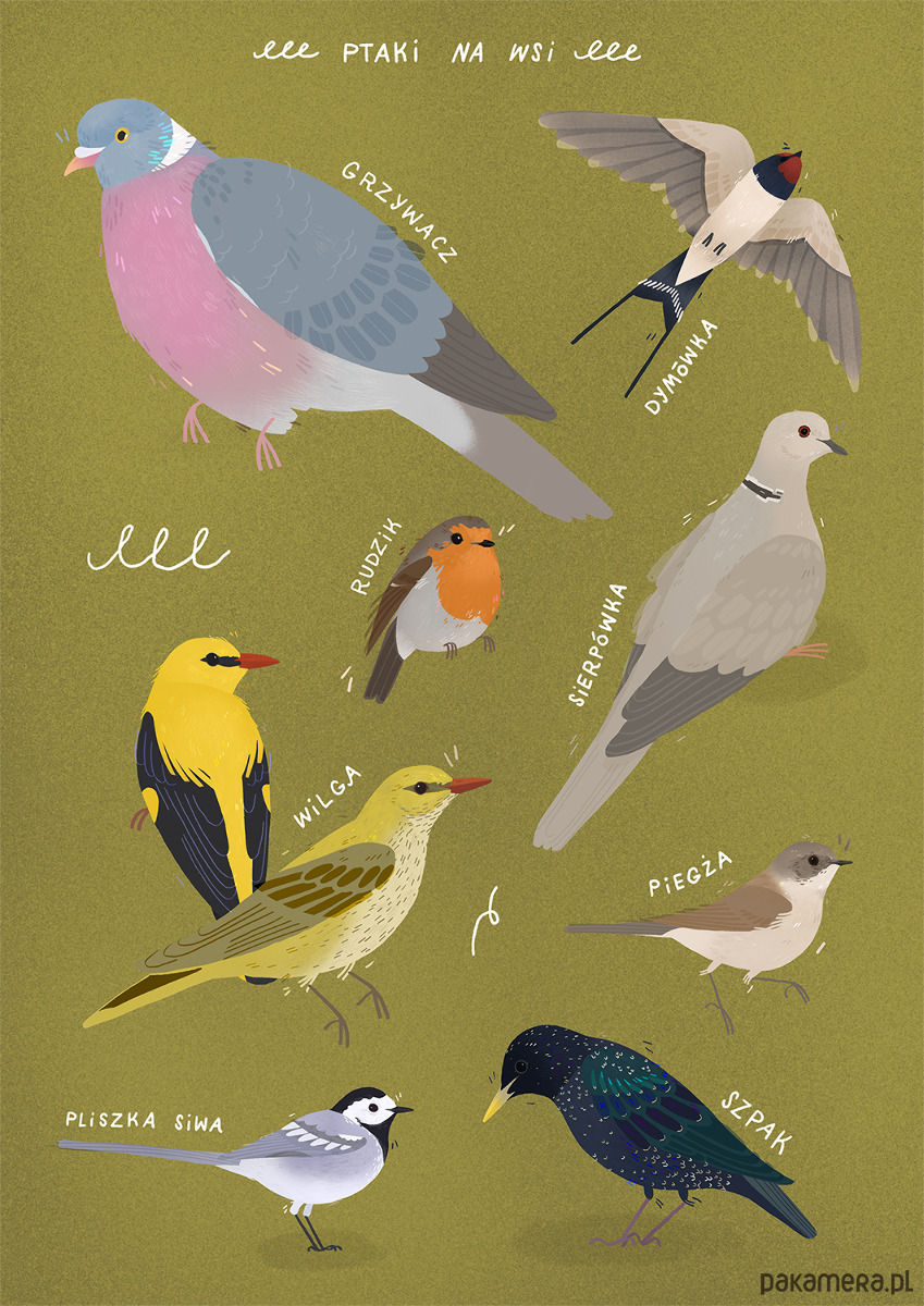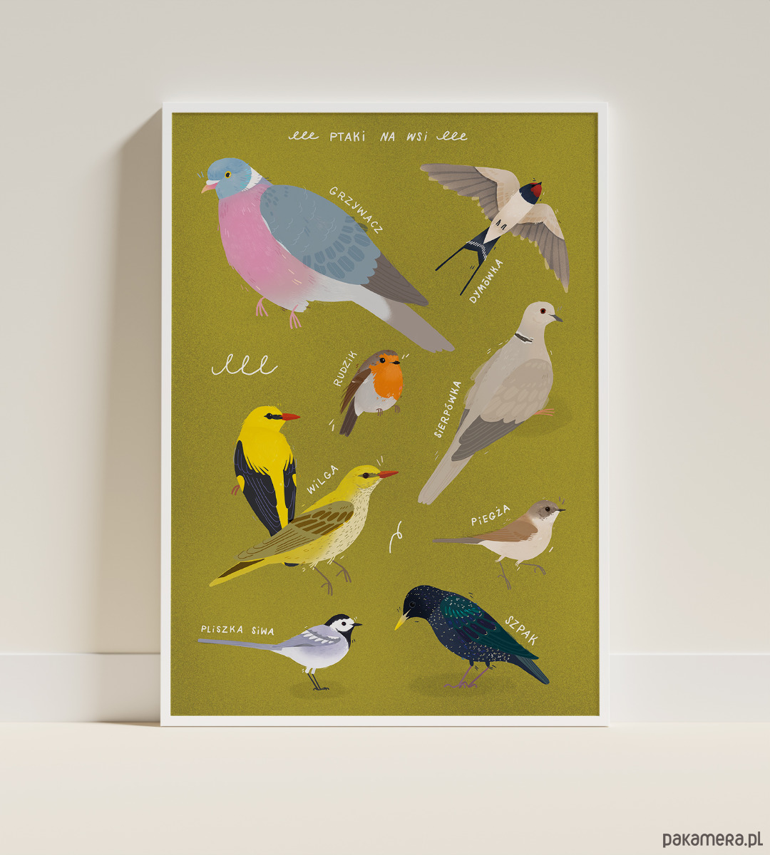 Autorski plakat A3 z dzikimi ptakami żyjącymi na wsi.