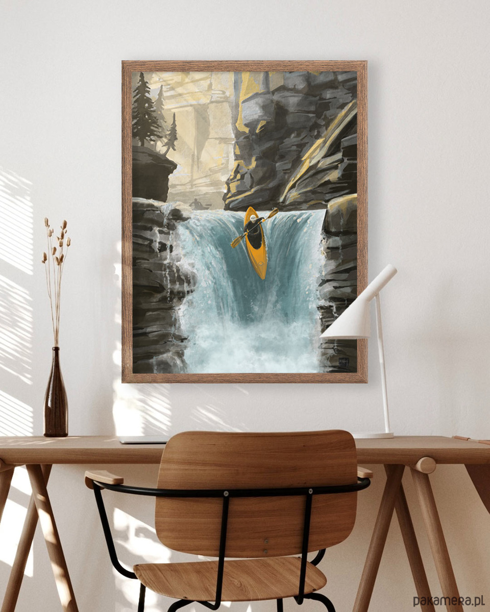 Plakat "Ekstremalne wyprawy kajakowe" łączy w sobie miłość do sportowych wyzwań ze spektakularnymi widokami. Niezależnie od tego czy serce oddaliście spływom po górskich rzekach, creekingowi, czy marzycie o pokonywaniu niedostępnych wodospadów, kajakarski plakat jest idealnym rozwiązaniem na wystrój Waszego wnętrza. Autorem grafiki jest kanadyjski artysta Sassan Filsoof.
