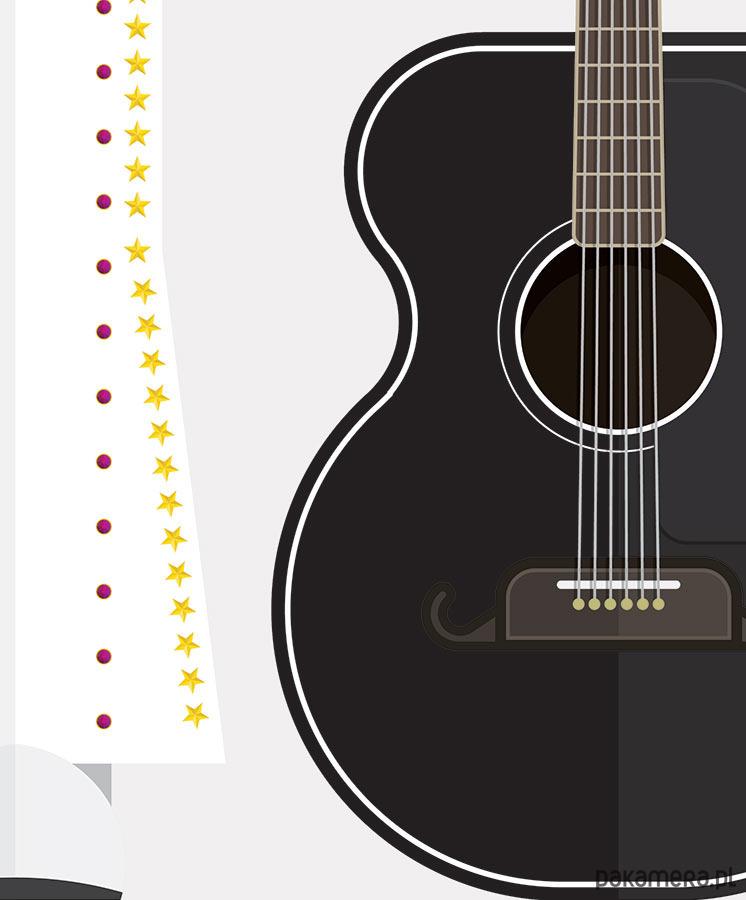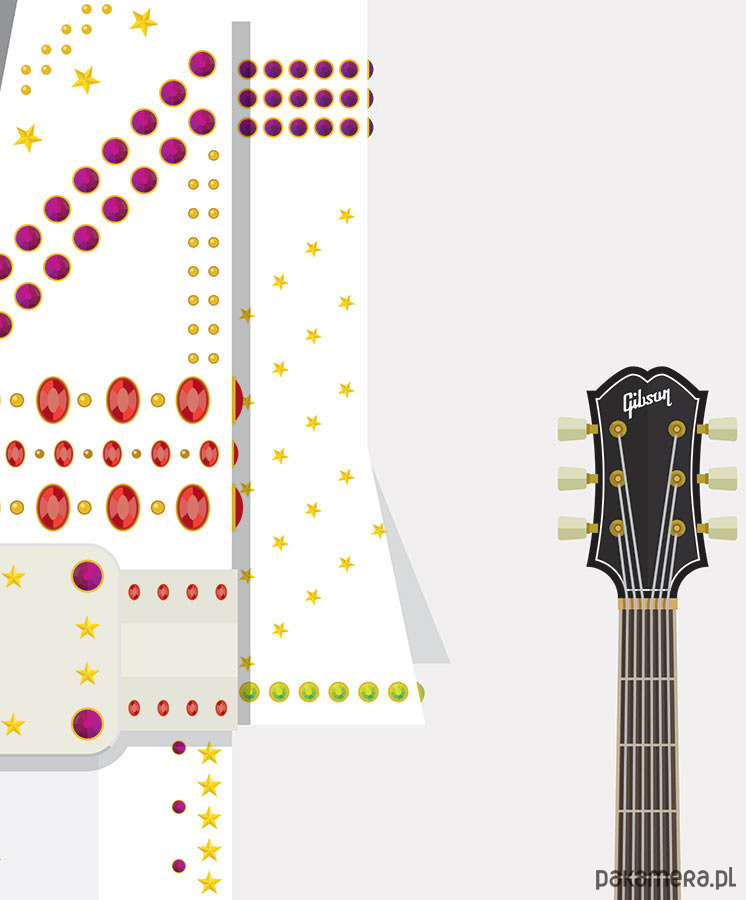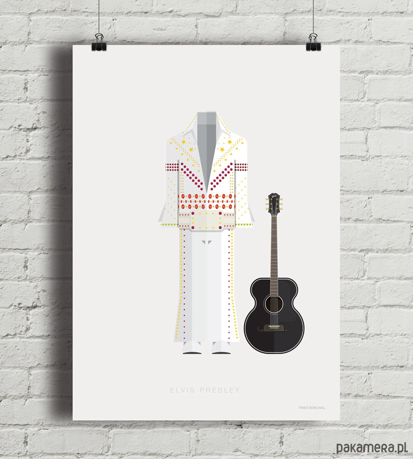 Plakat z autorską grafiką inspirowany Elvisem Presleyem. Pochodzi z serii "Famous Music Costumes" i przedstawia charakterystyczny strój króla Rock and Rolla.