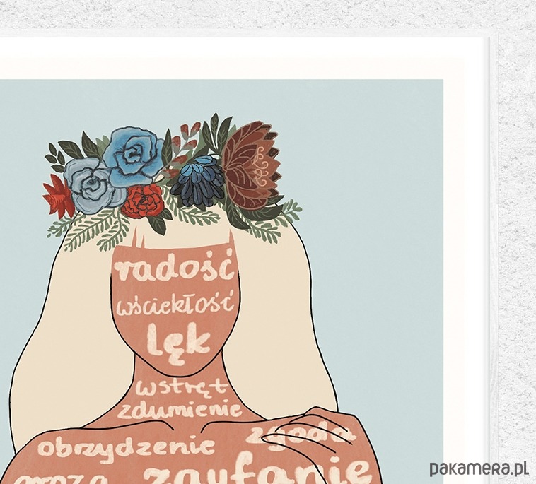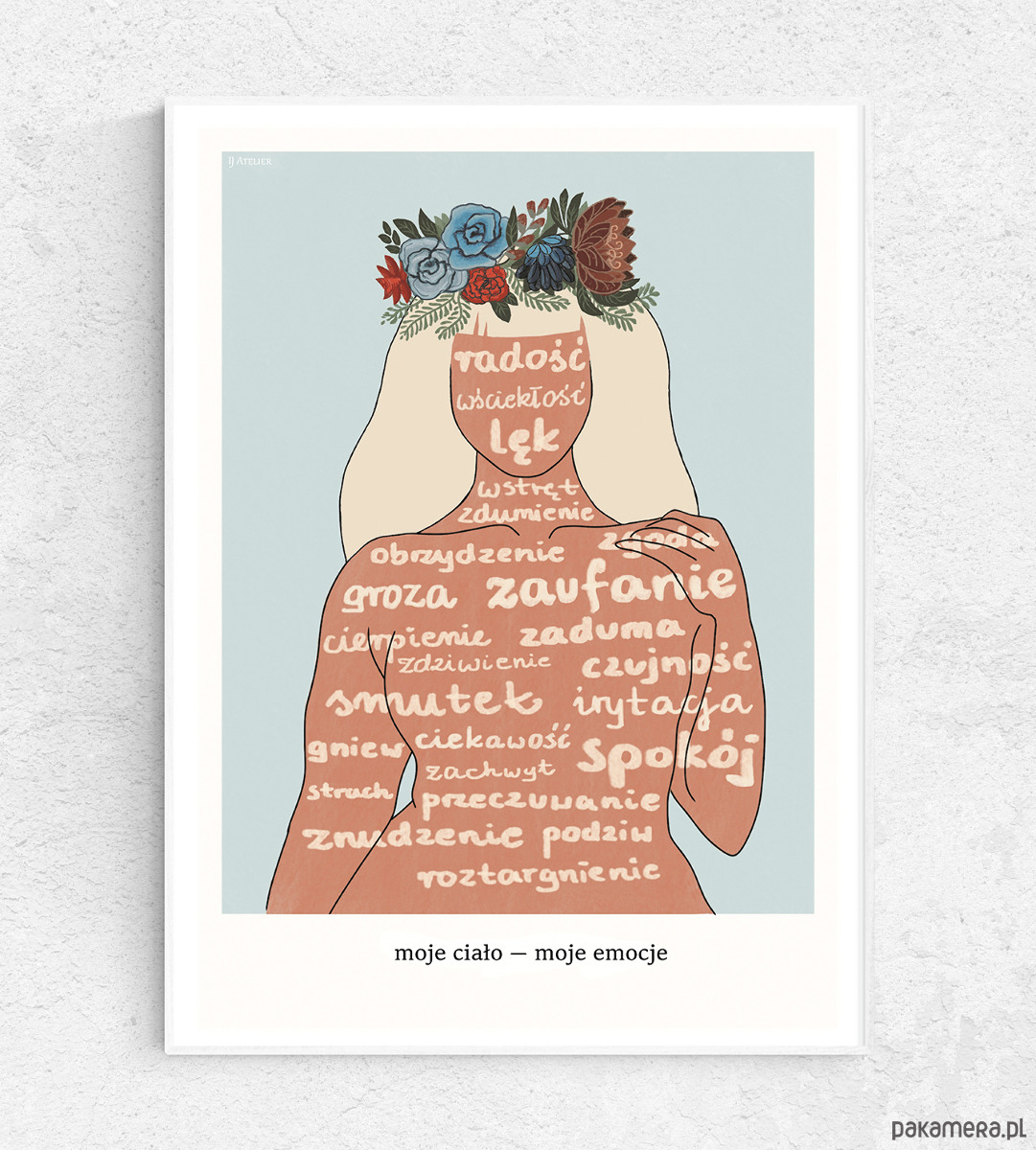 Grafiki z tej pełnej emocji serii powstały w oparciu o teorię Plutchika. Psycholog ten wyróżnił osiem podstawowych uczuć, które zniuansował na podstawie ich natężenia. Nie zawsze bowiem odczuwamy po prostu smutek, czasem to głębokie cierpienie, czasem tylko zaduma. Radość może być ekstazą albo uczuciem błogości. Stan czujności czy znudzenia to też forma naszej emocjonalności. Plakaty z tej serii tworzyłam po to, byśmy mogły na chwilę zatrzymać galopujące myśli i poczuć, jakie emocje dominują właśnie w naszym ciele. Ta świadomość prowadzi do akceptacji - bo każda emocja jest częścią nas.