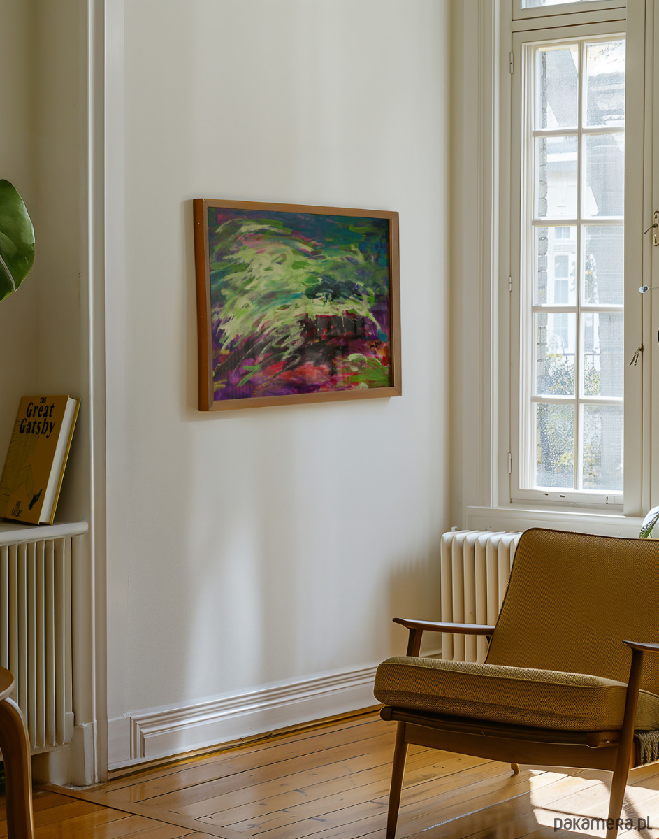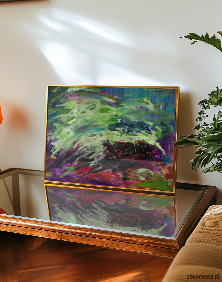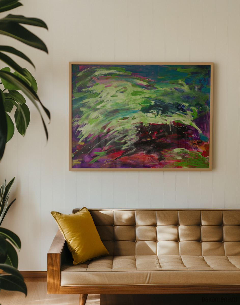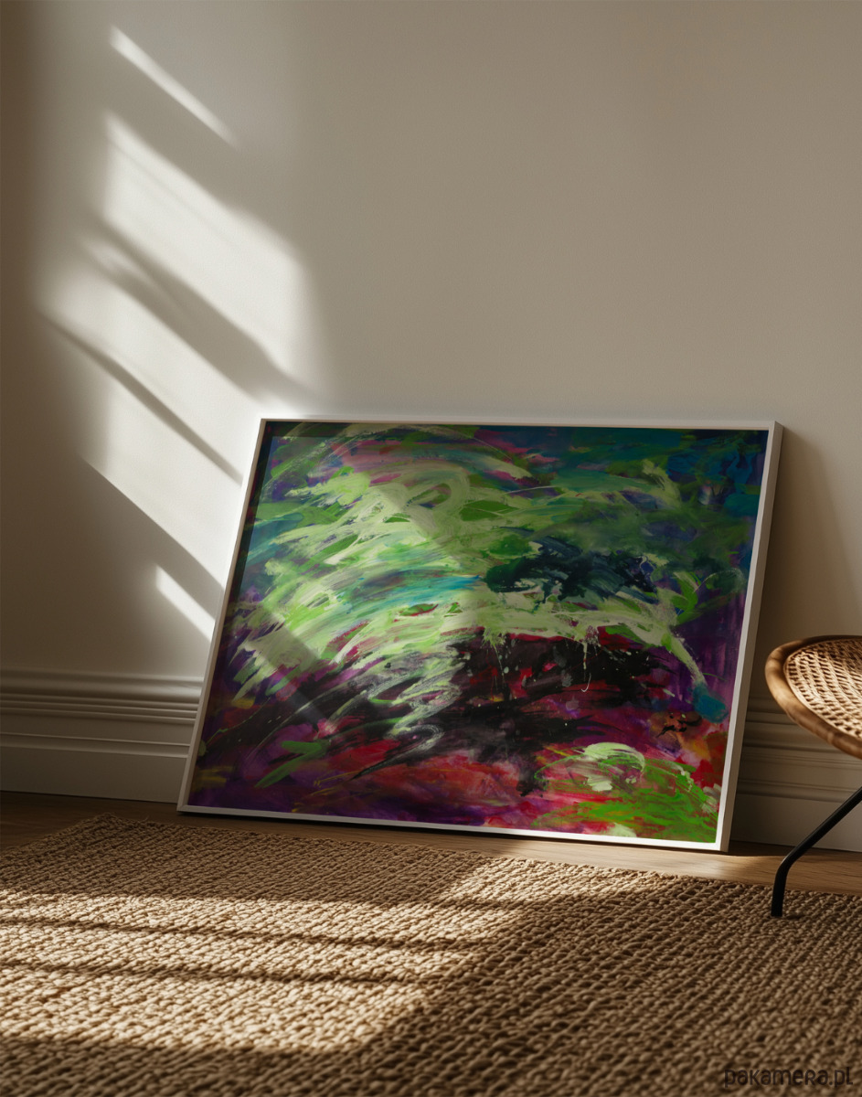 Obraz wygląda jak spontaniczny zapis natury w ruchu — epizod pomiędzy poruszeniem a uspokojeniem, pomiędzy światłem a cieniem. Kompozycja żyje, oddycha i rezonuje emocją. Intensywność koloru i gestu sprawia, że dzieło natychmiast staje się dominującym akcentem we wnętrzu, nadając mu świeżości, dynamiki i twórczej ekspresji.