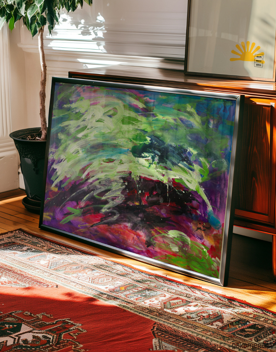 Abstrakcyjne dzieło pełne surowej, nieokiełznanej energii — jak spotkanie żywiołów w jednym momencie. Gęste zielone smugi przypominają podmuch gwałtownego wiatru, który przetacza się nad ciemnym, pulsującym krajobrazem. Pod nimi pojawiają się ciepłe czerwienie i magenty, jak rozgrzana ziemia po burzy, a chłodne błękity i fiolety tworzą tło przypominające niebo w ciągłej zmianie.