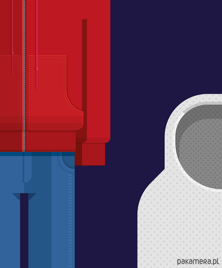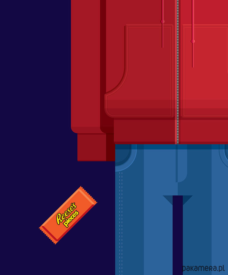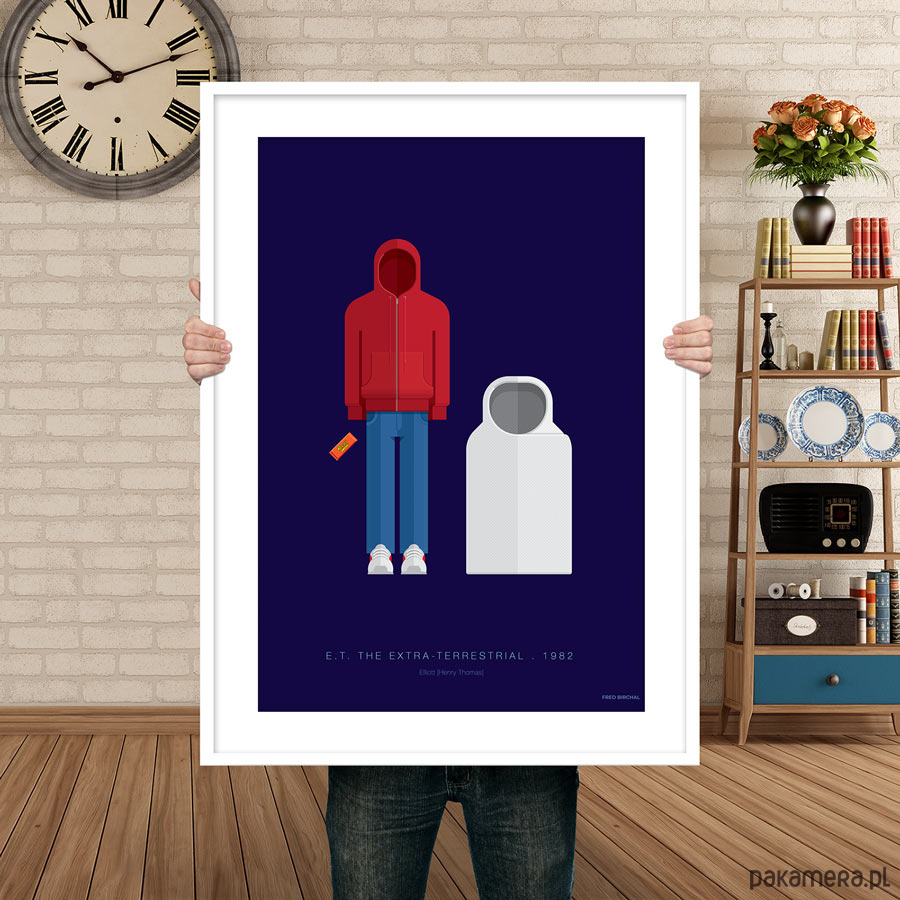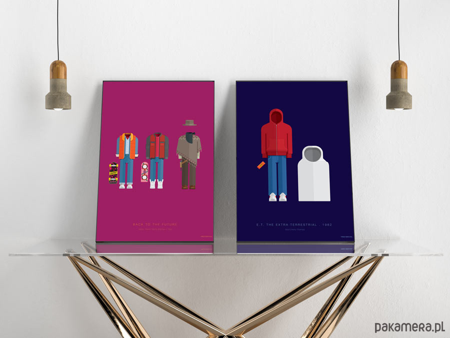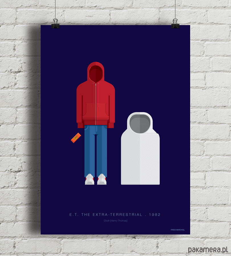Plakat z autorską grafiką inspirowany filmem "E.T.", reż. Steven Spielberg. Pochodzi z serii "Cinema Costumes" (Kostiumy kinowe) i przedstawia stroje Elliotta i E.T.