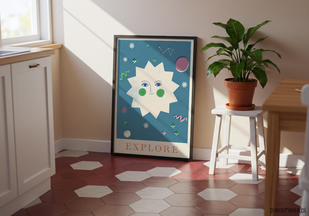 Cyfrowy wydruk autorskiej ilustracji. Zaprojektowany i wydrukowany w Polsce. Plakat geometryczny z retro charakterem.