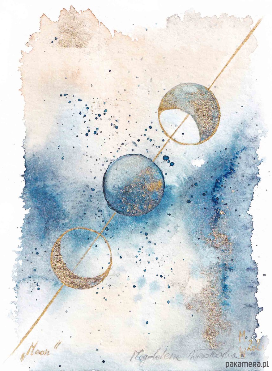 Abstrakcyjne magiczne malowane akwarelą to cudowne tło z gwiezdnym pyłem a na tym piękne fazy księżyca.