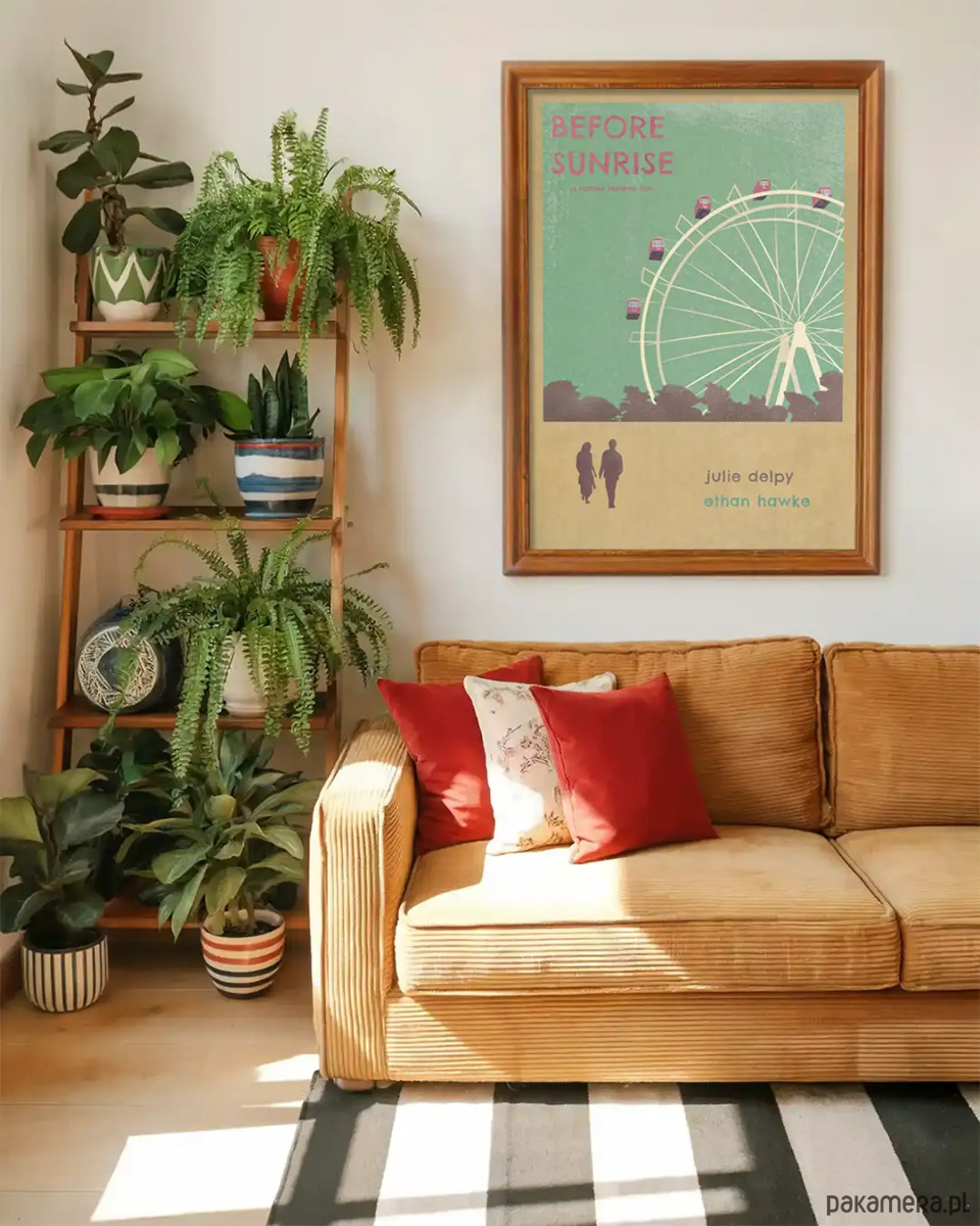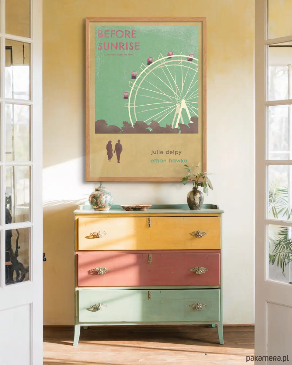 Plakat inspirowany filmem "Przed wschodem słońca" ("Before Sunrise") w reżyserii Richarda Linklatera. Klasyka niebanalnego romansu. Plakat utrzymany jest w ciepłych barwach i stanowić będzie świetną dekorację domu lub prezent dla miłośników kina.