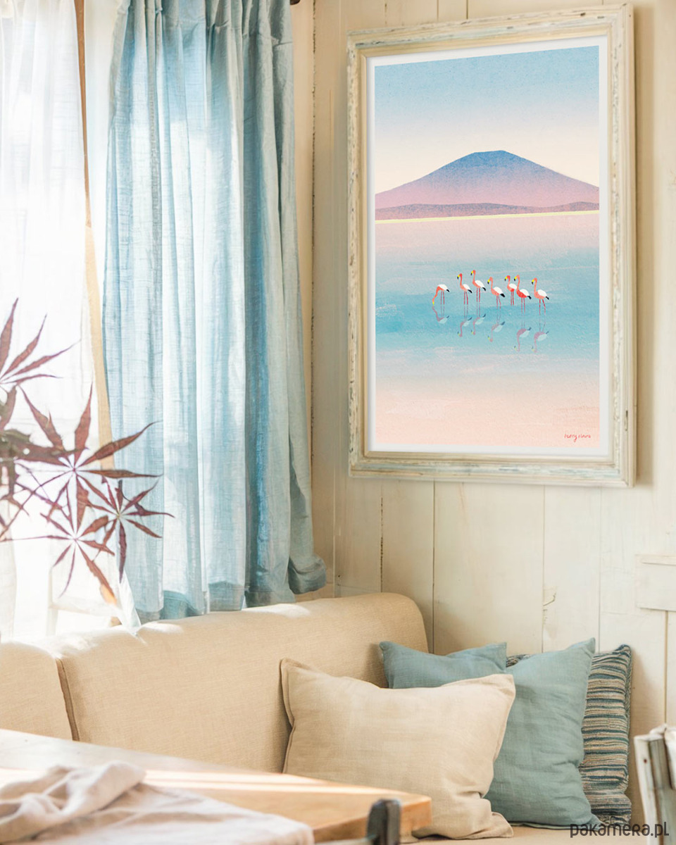 Plakat „Flamingi - odbicie w jeziorze” to piękna przyrodnicza dekoracja. Łagodne połączenie błękitu, pudrowego różu i fioletu nadaje grafice wrażenie ulotności. Na plakacie stado flamingów brodzi w przejrzystym jeziorze.