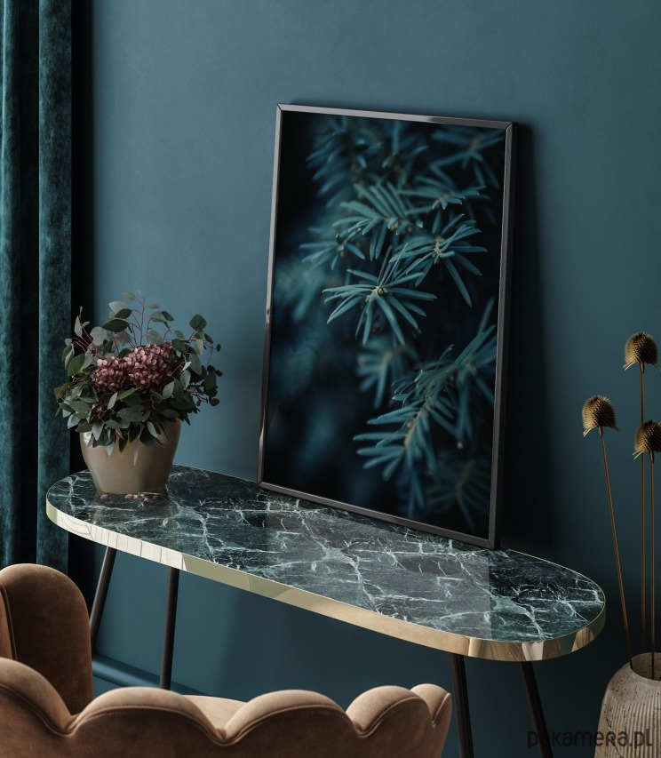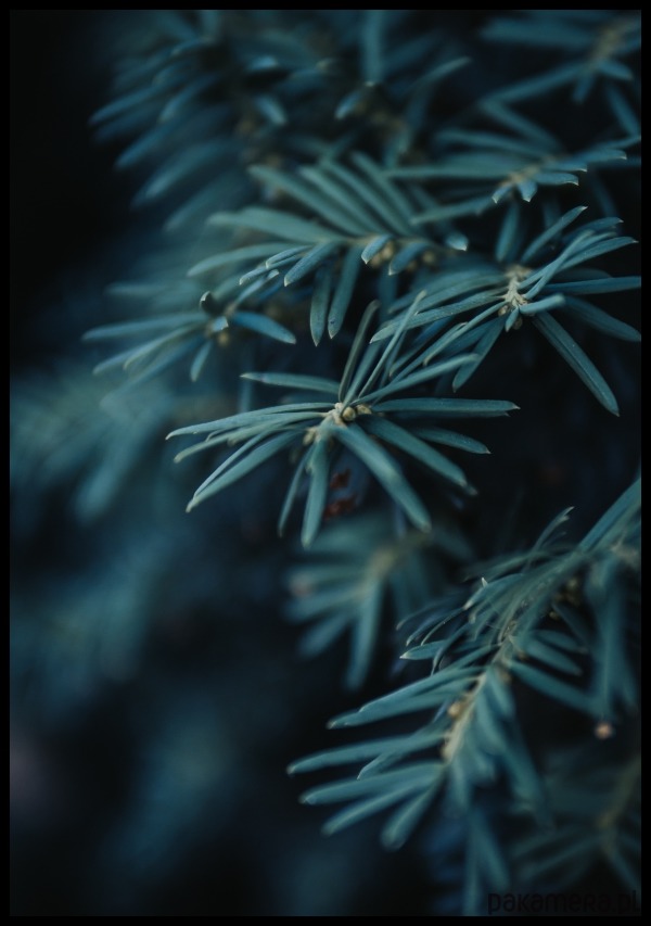 Plakat przedstawiający zbliżenie na gałązkę zielonej choinki.