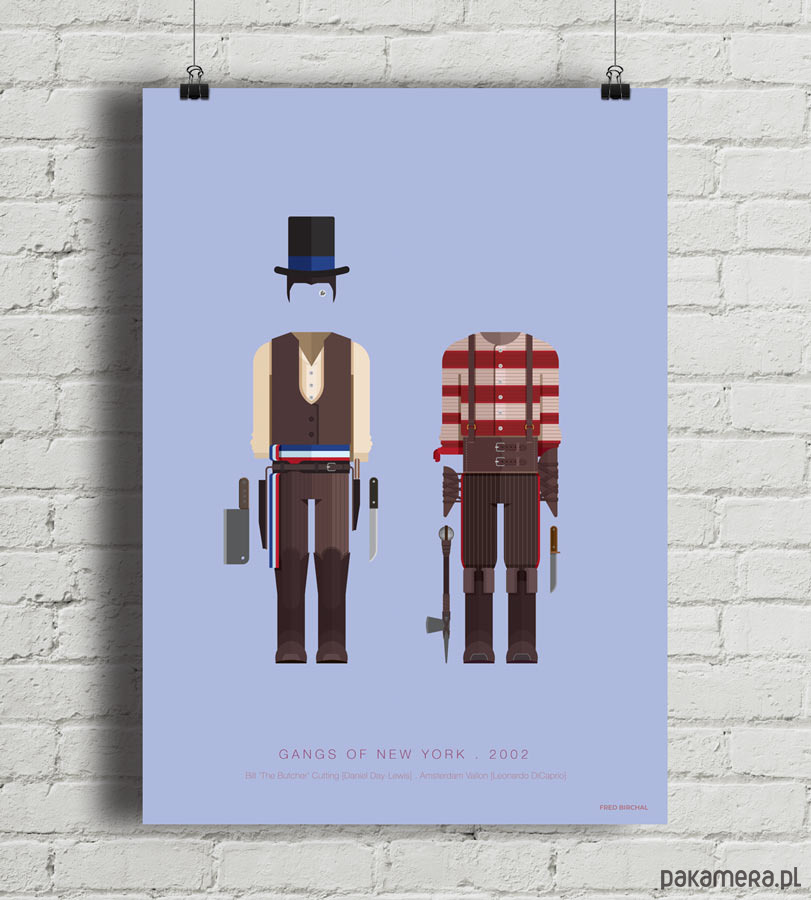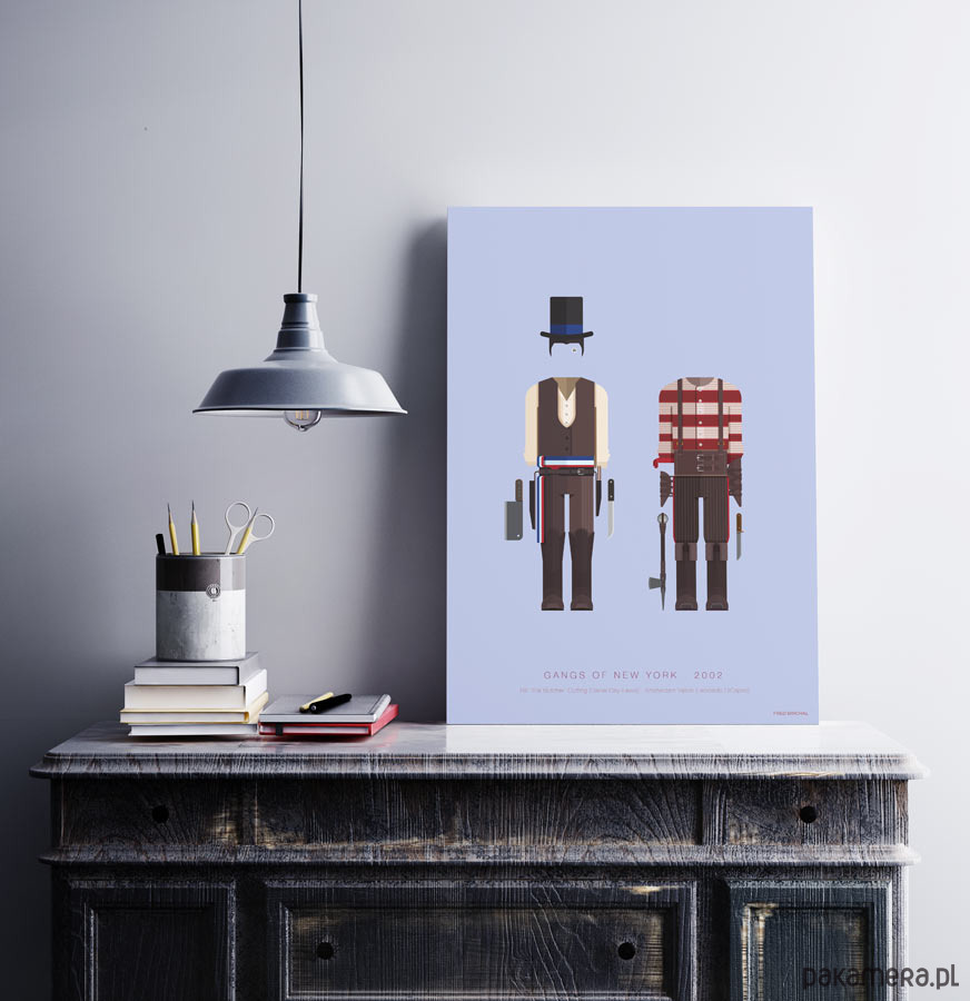 Plakat z autorską grafiką inspirowany filmem "Gangi Nowego Jorku" (Gangs Of New York), reż. Martin Scorsese. Pochodzi z serii "Cinema Costumes" (Kostiumy kinowe) i przedstawia stroje Amsterdama Vallona i Billa Cuttinga.