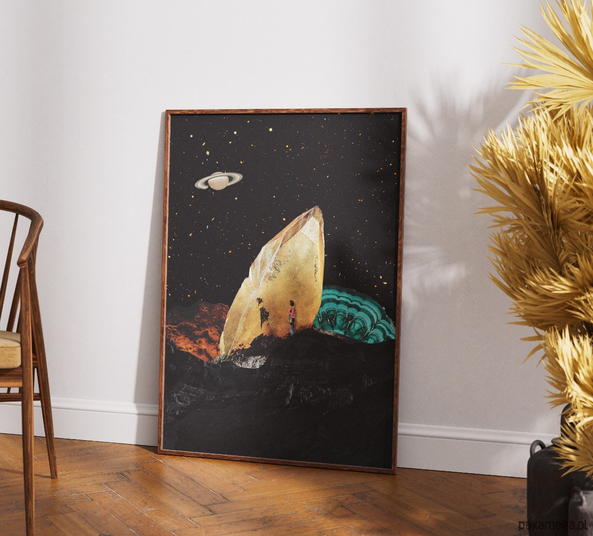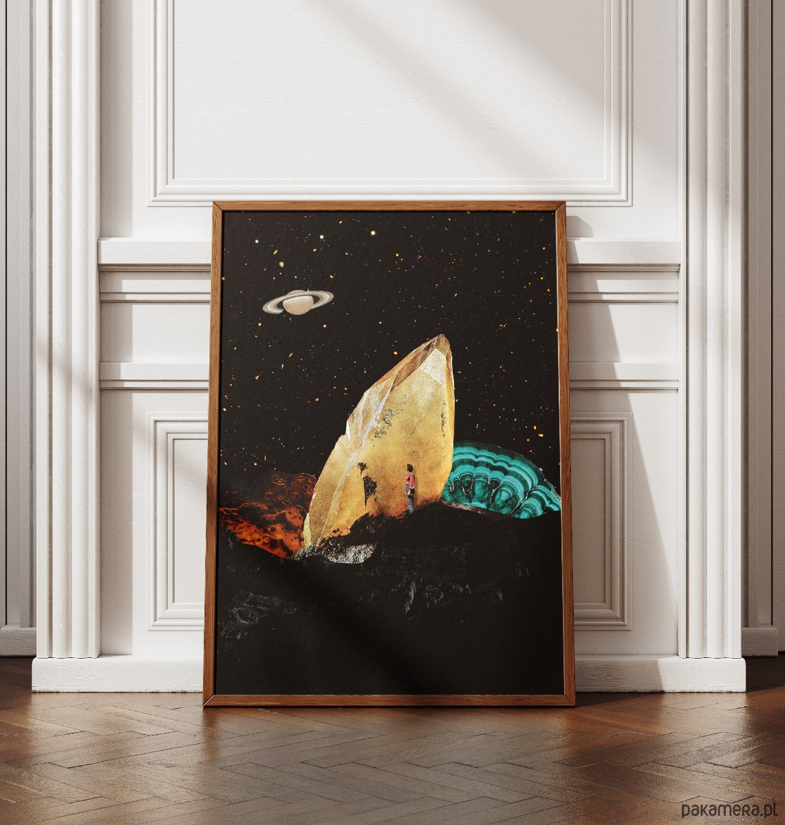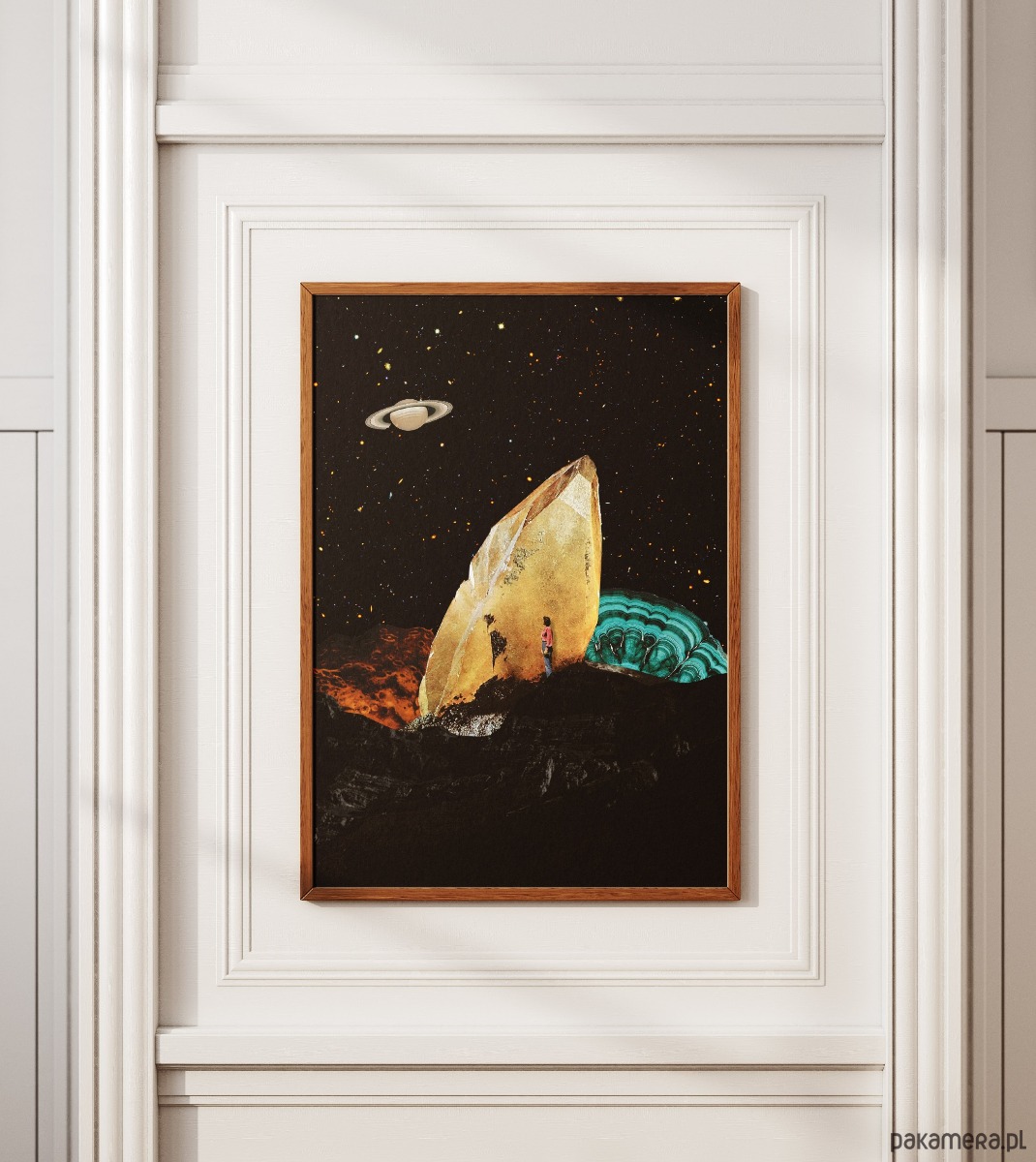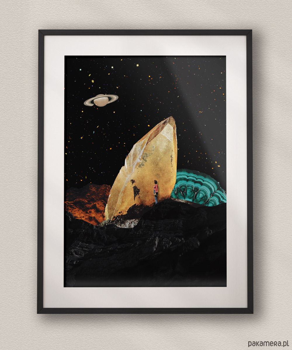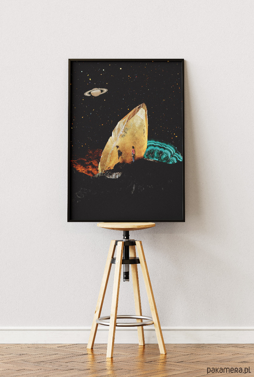 Ten surrealistyczny plakat w stylu kolażu vintage doskonale wpisuje się w nowoczesne i eklektyczne wnętrza, dodając im artystycznego wyrazu oraz szczypty intrygującego humoru. Dzięki swojej unikalnej kompozycji łączącej motywy retro z kosmiczną symboliką, będzie stanowił centralny punkt dekoracyjny w salonie, gdzie przyciągnie wzrok gości i stanie się ciekawym tematem do rozmów. Świetnie odnajdzie się również w domowym gabinecie lub pracowni twórczej, pobudzając kreatywność i przełamując monotonię biurowego otoczenia. Jego stonowana, a zarazem kontrastowa kolorystyka sprawia, że pasuje także do sypialni urządzonej w stylu loftowym lub industrialnym, nadając jej indywidualnego charakteru. Można go z powodzeniem zawiesić w przedpokoju, aby od samego progu witał domowników oryginalnym designem, lub w nowoczesnej kawiarni, gdzie podkreśli nieformalną i stylową atmosferę miejsca.