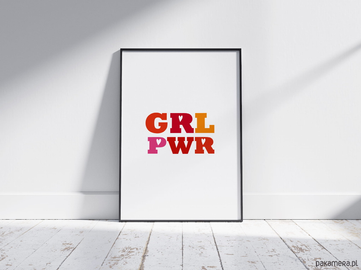 Plakat z tekstem GRL PWR, w odcieniach czerwieni i różu, na białym tle.