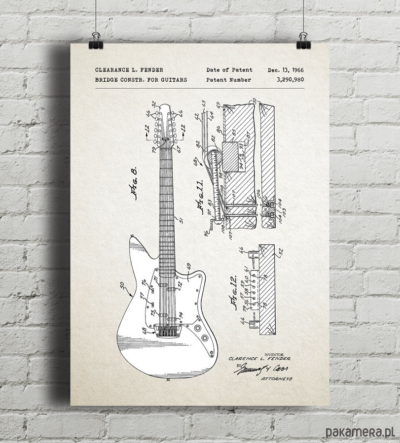 Plakat z reprodukcją patentu na konstrukcję mostka do gitary, autorstwa legendarnego Clearancea L. Fendera. Patent o numerze 3,290,980 został udzielony w 1966 roku przez Urząd Patentów i Znaków Towarowych Stanów Zjednoczonych.