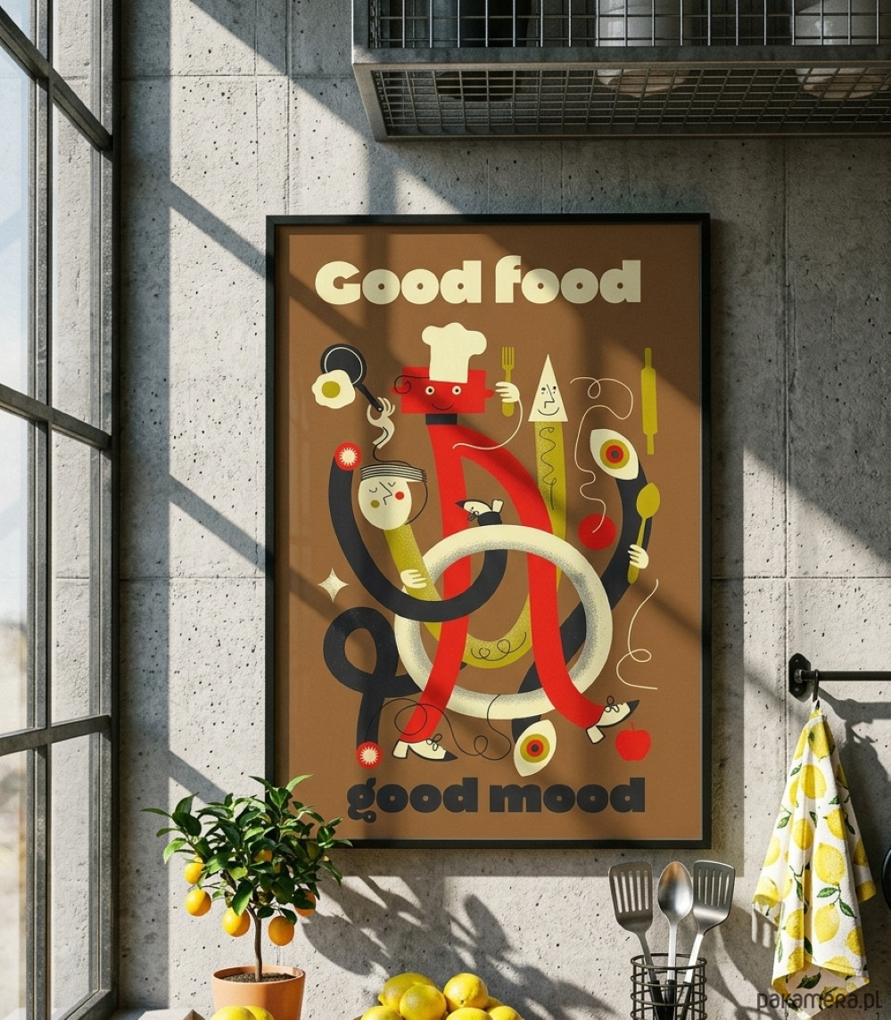 Ten wyjątkowy zabawny portret kucharza w tańcu został zaprojektowany w stylistyce nawiązującej do kultowych plakatów z czasów PRL-u. Minimalistyczna forma, odważna kreska oraz ciepła, "kuchenna" kolorystyka sprawiają, że grafika ta stanie się sercem każdej jadalni, restauracji czy klimatycznego baru mlecznego.