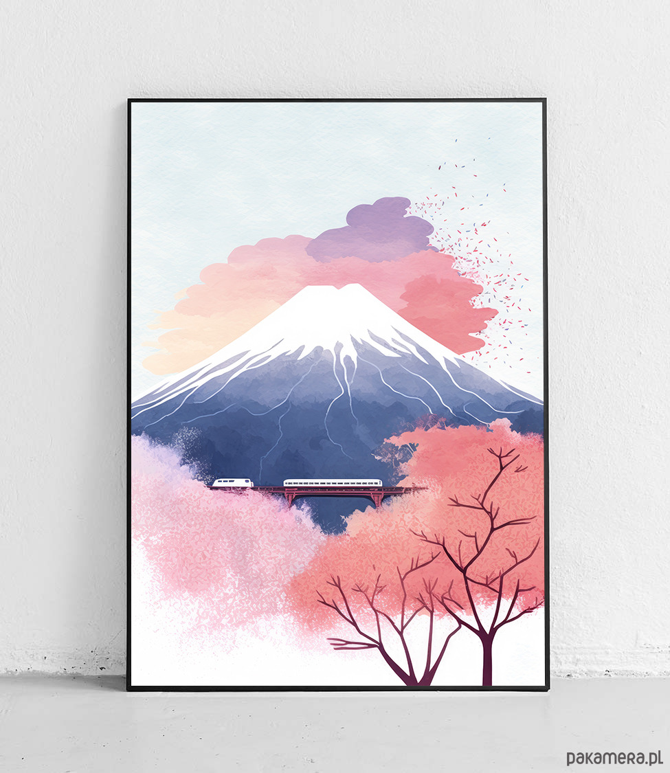 Plakat Góra Fuji w różach i błękitach z pociągiem