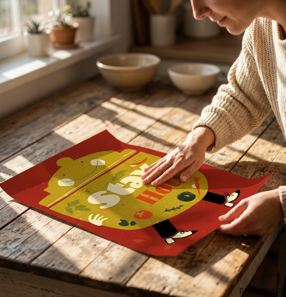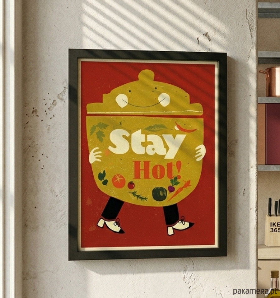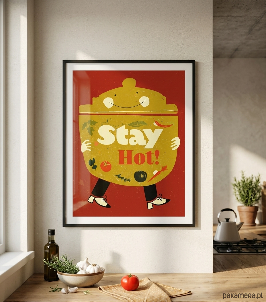 Ten wyjątkowy zabawny portret kucharza garnka został zaprojektowany w stylistyce nawiązującej do kultowych plakatów z czasów PRL-u. Minimalistyczna forma, odważna kreska oraz ciepła, "kuchenna" kolorystyka sprawiają, że grafika ta stanie się sercem każdej jadalni, restauracji czy klimatycznego baru mlecznego.