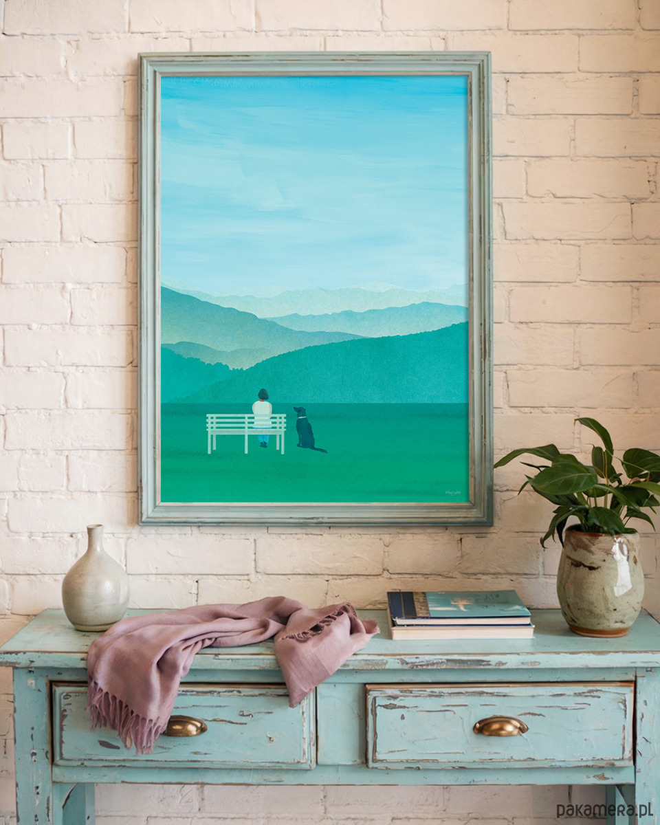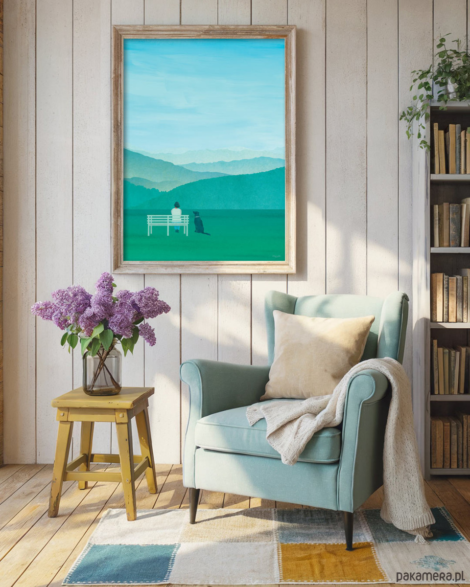 Plakat przedstawia moment, gdy po całym dniu wędrówki można zasiąść na ławce i podziwiać widok ścielący się u naszych stóp. Zielono-niebieski zmierzch zmienia krajobraz w czarodziejskie miejsce, trochę odrealnione, pełne półcieni i mgieł.