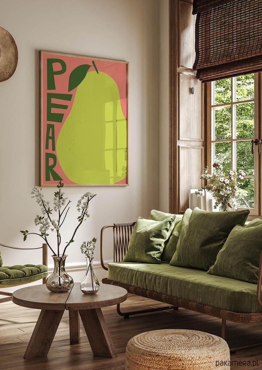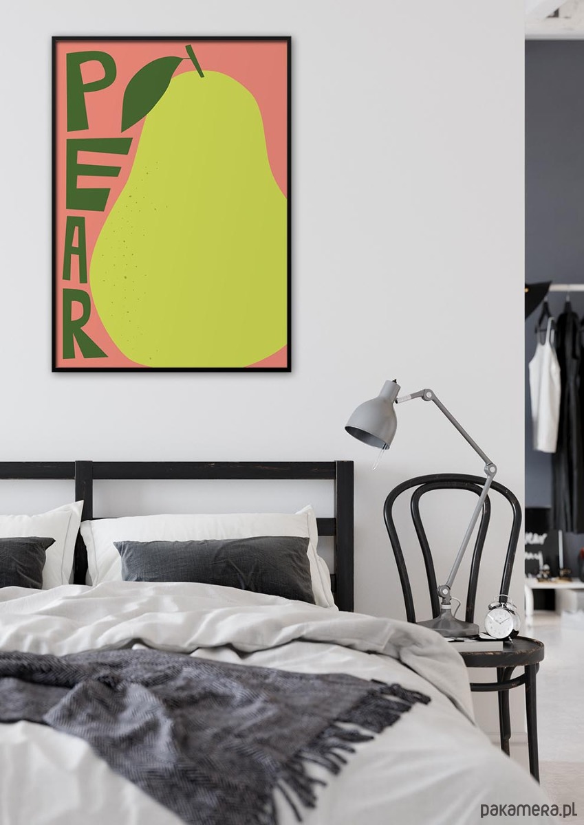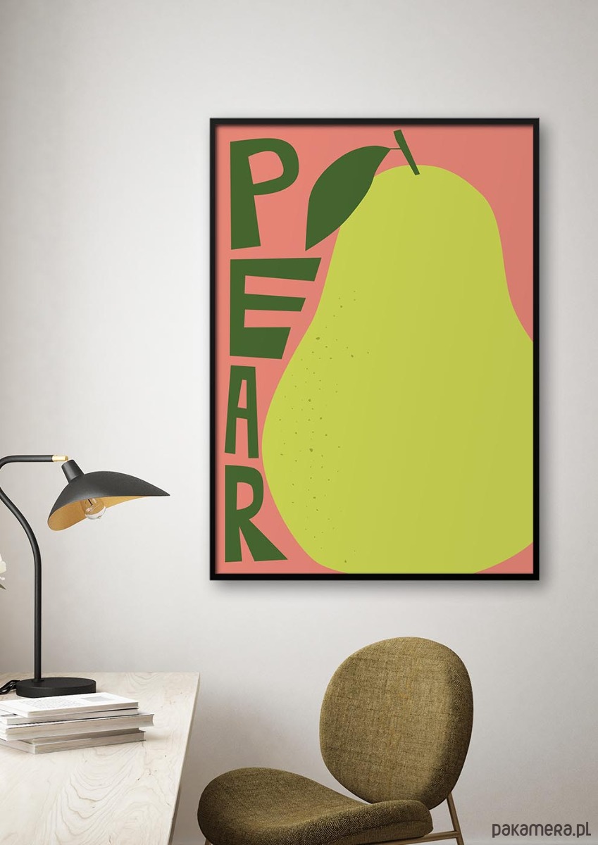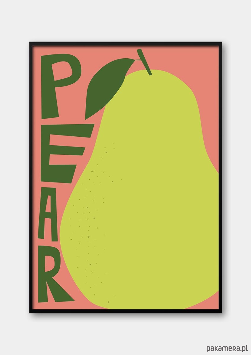 Plakat Gruszka/Pear to nowoczesna ilustracja inspirowana naturą, utrzymana w minimalistycznej formie i intensywnej kolorystyce. Motyw gruszki w połączeniu z wyrazistą typografią nadaje wnętrzu świeżości, energii i designerskiego charakteru. Idealny do kuchni, salonu, biura oraz nowoczesnych przestrzeni komercyjnych.