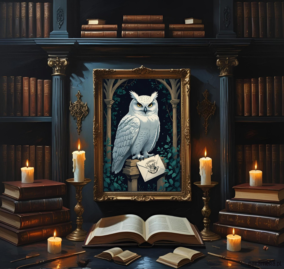 Ilustracja z sową Hedwigą trzymającą list z Hogwartu.