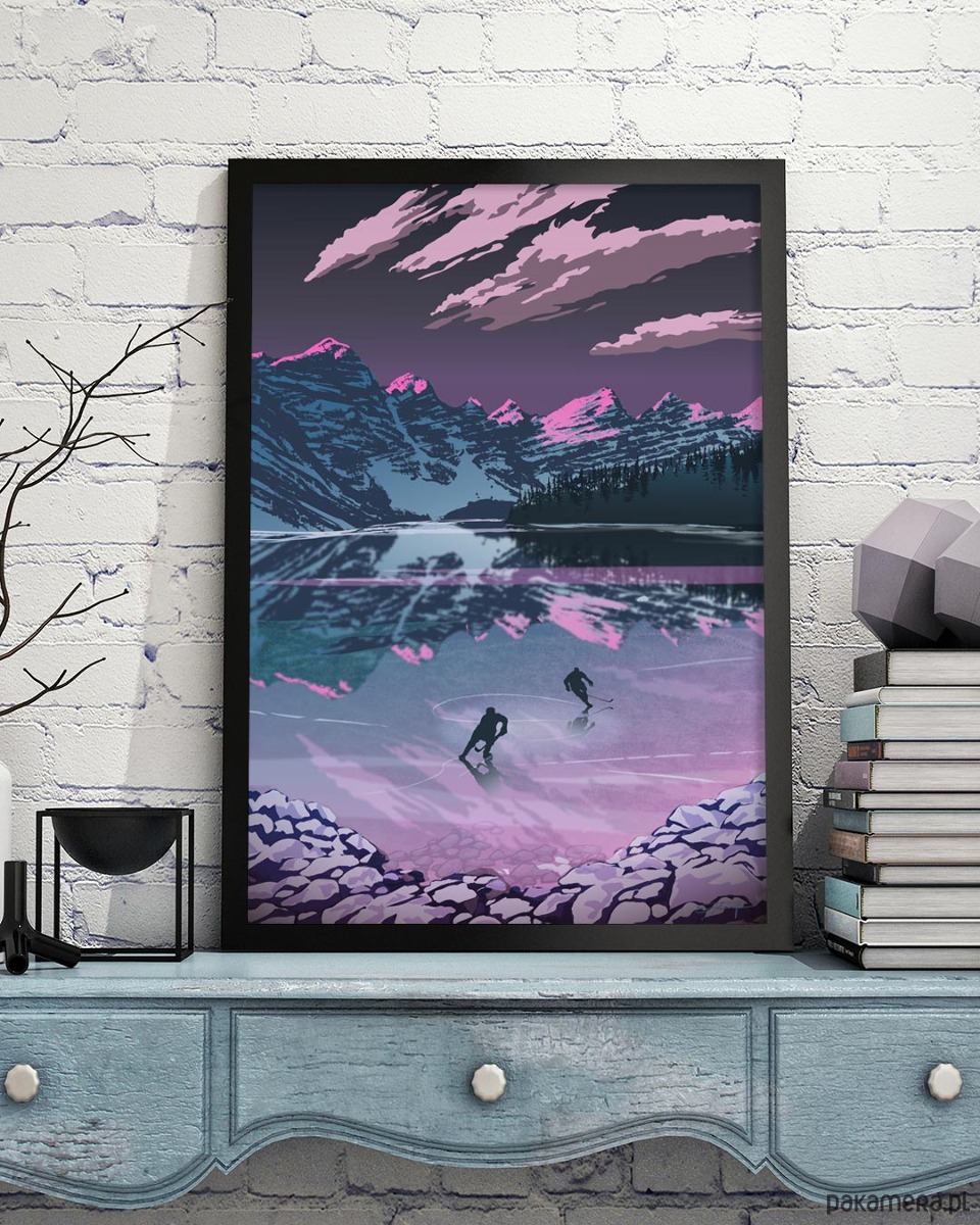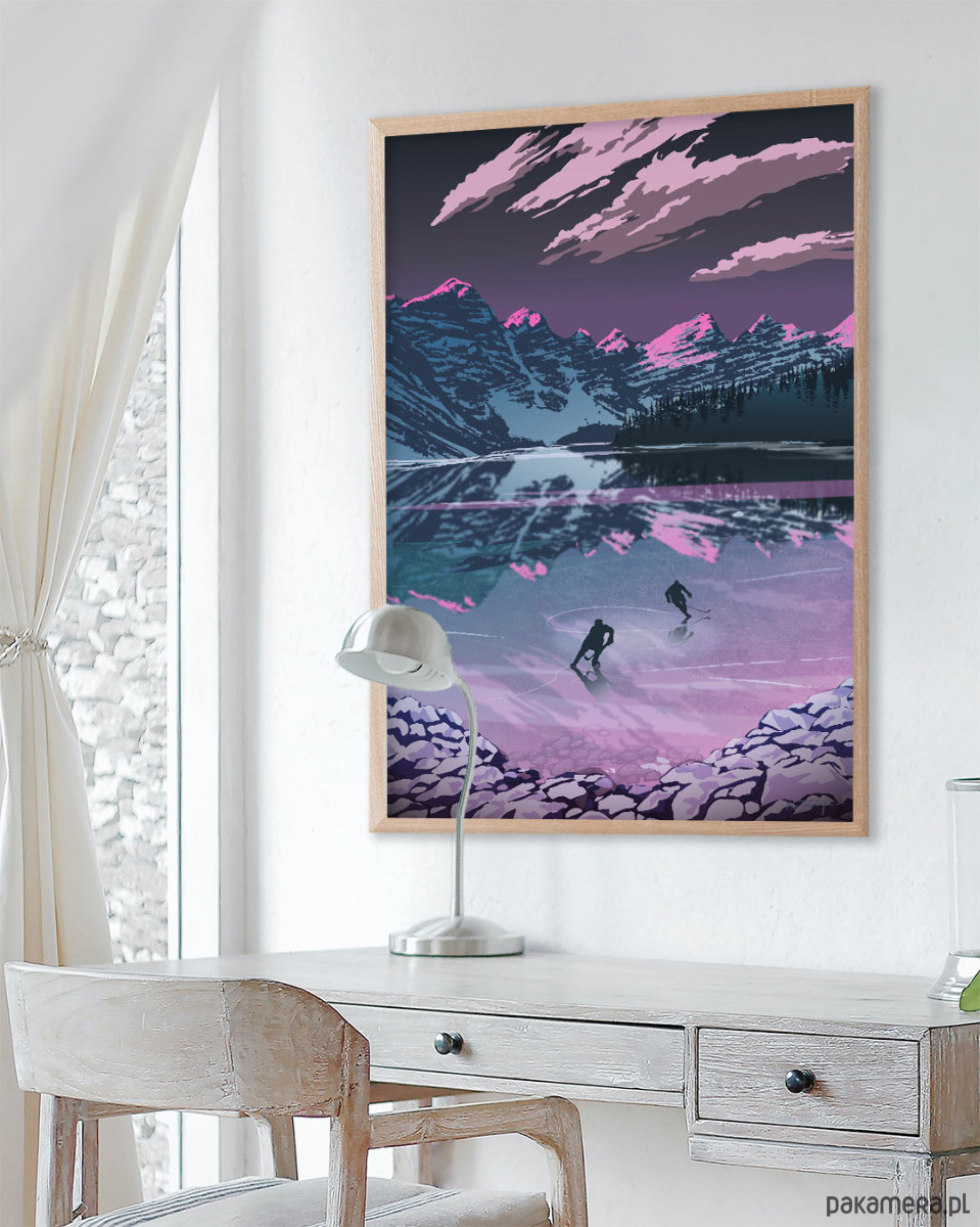 Plakat "Hokej na lodzie" to idealna dekoracja i pomysł na prezent dla każdego, kto kocha sporty zimowe. Grafika ukazuje łyżwiarzy grających w hokeja na zamarzniętym stawie wśród szczytów gór. Zimowy krajobraz oblany jest fioletowym blaskiem zachodzącego słońca. Autorem grafiki jest kanadyjski artysta Sassan Filsoof.